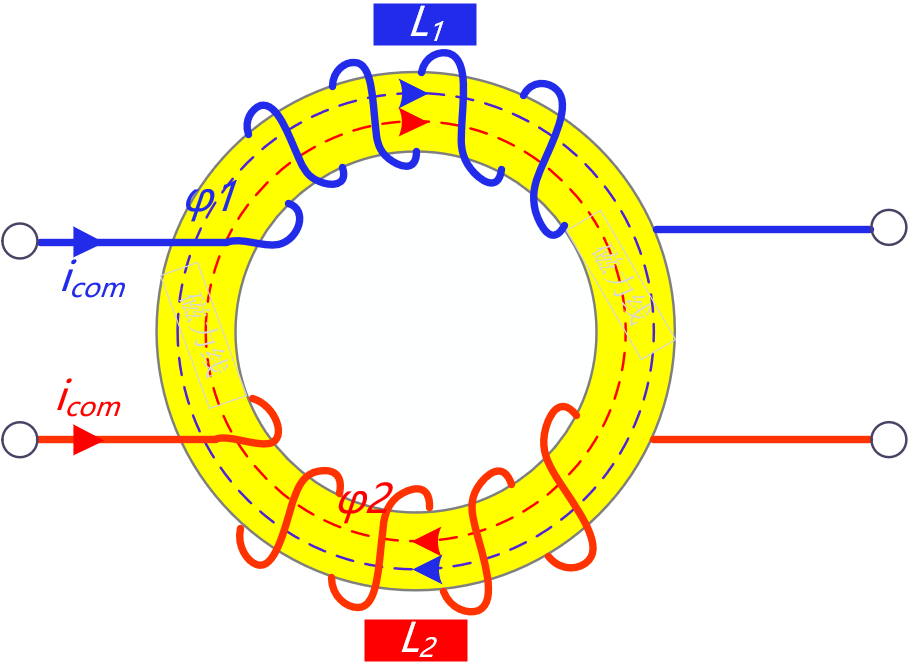 若在以某种磁性材料的磁环上绕上同向的一对线圈,当交变电流通过时,因为电磁感应而在线圈中产生磁通量。
