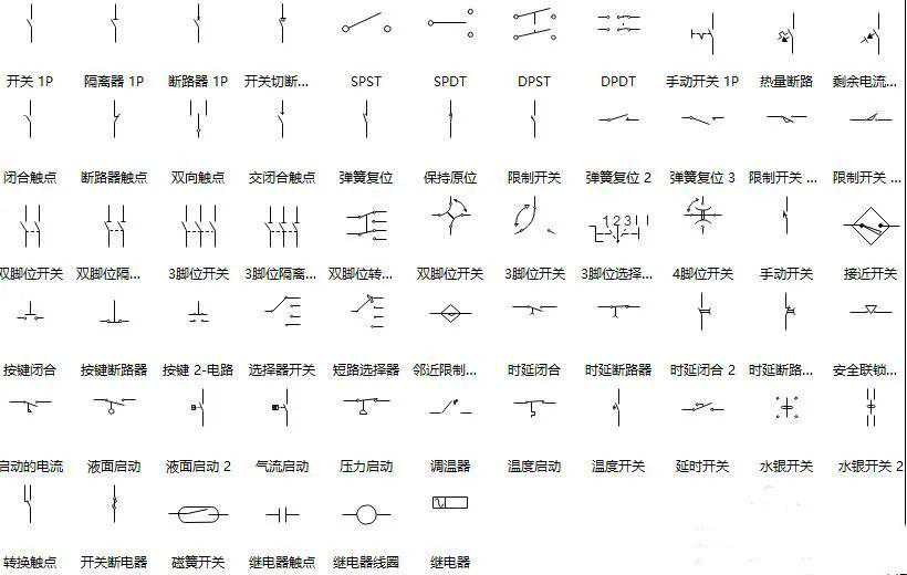开关和继电器符号是电路图中的控制元件,能够调节或改变电路的工作性能。