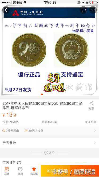 有人就发现,在某宝上,已经有一些在预售建军币的商家开价13.8元一枚,而且销量超过一千五百笔。假设这样的销量并非通过刷单实现,即使是每笔都是一枚,那么商家没预约十盒的建军币是不可能做的了生意的,何况不可能每人只要一枚。