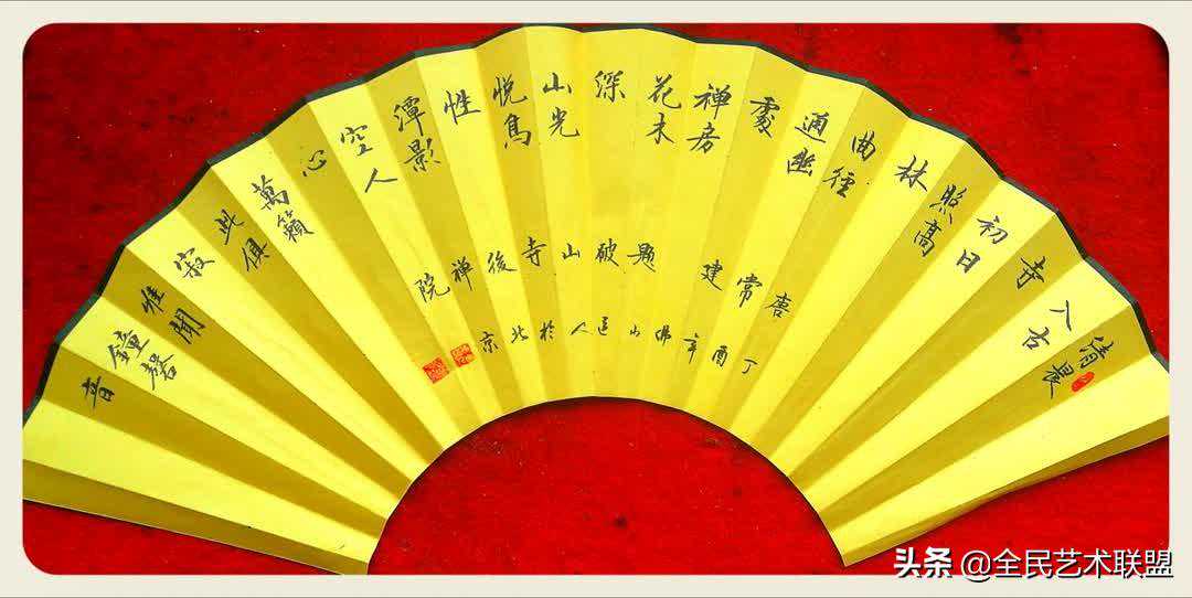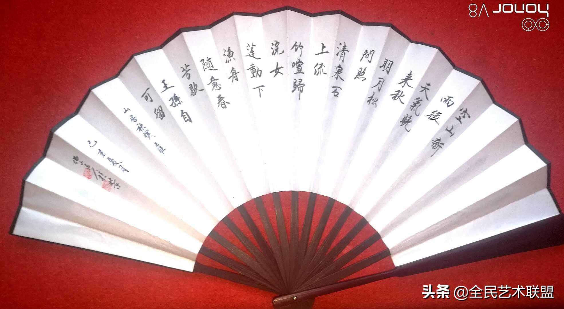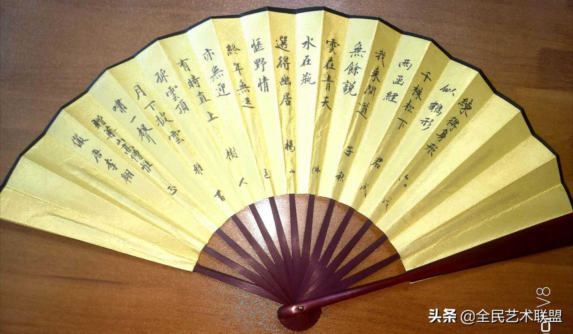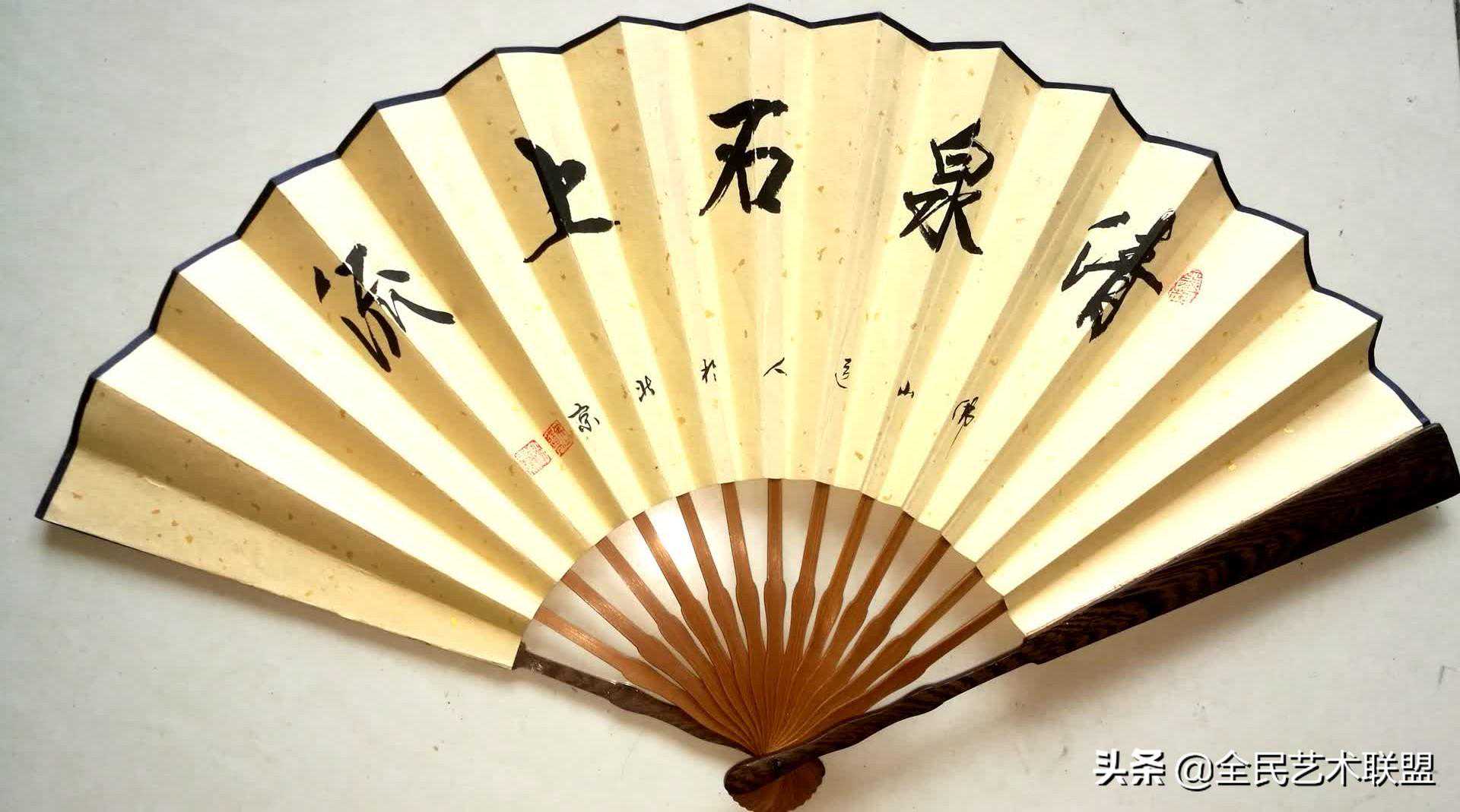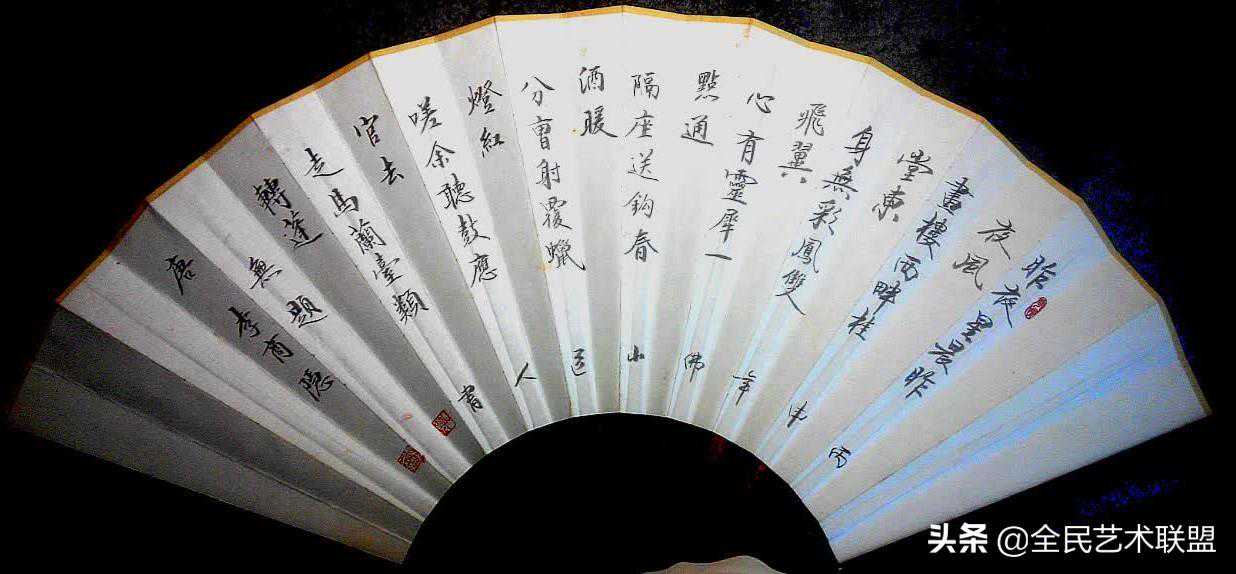 当前,扇面书法作为欣赏和收藏之用,有其独到的艺术特色,给人以美的享受。但是扇面书法的章法比一般书法的创作就难了许多,主要是如何处理好扇骨与书写内容、字数的关系,这就需要周密计算字数,把需要书写的内容妥善安排在扇骨之间的空白处。总的原则是协调一致,不能前紧后松,或前松后紧。扇面的书写,尤其上骨的扇面书写,因高低不平,行笔难度很大,一般很难写好,因此欲书写的字数不适宜太少。书写多字数时,可将扇面尽量展平,左、右、上需用镇纸压住,将字写在扇骨之间的空白处。裱好的扇面,因宣纸的效果失去一半,所以书写时不宜多蘸墨。另外,印章的选择不宜太大,需与扇面上字的大小相协调。