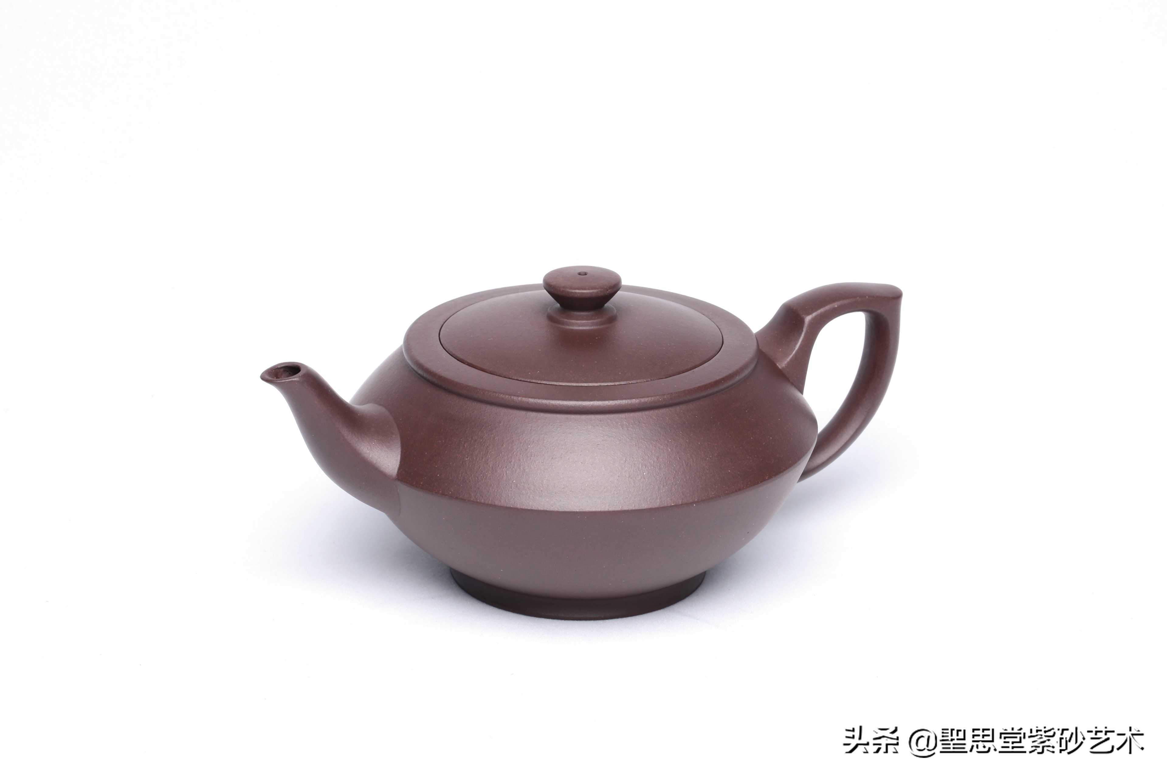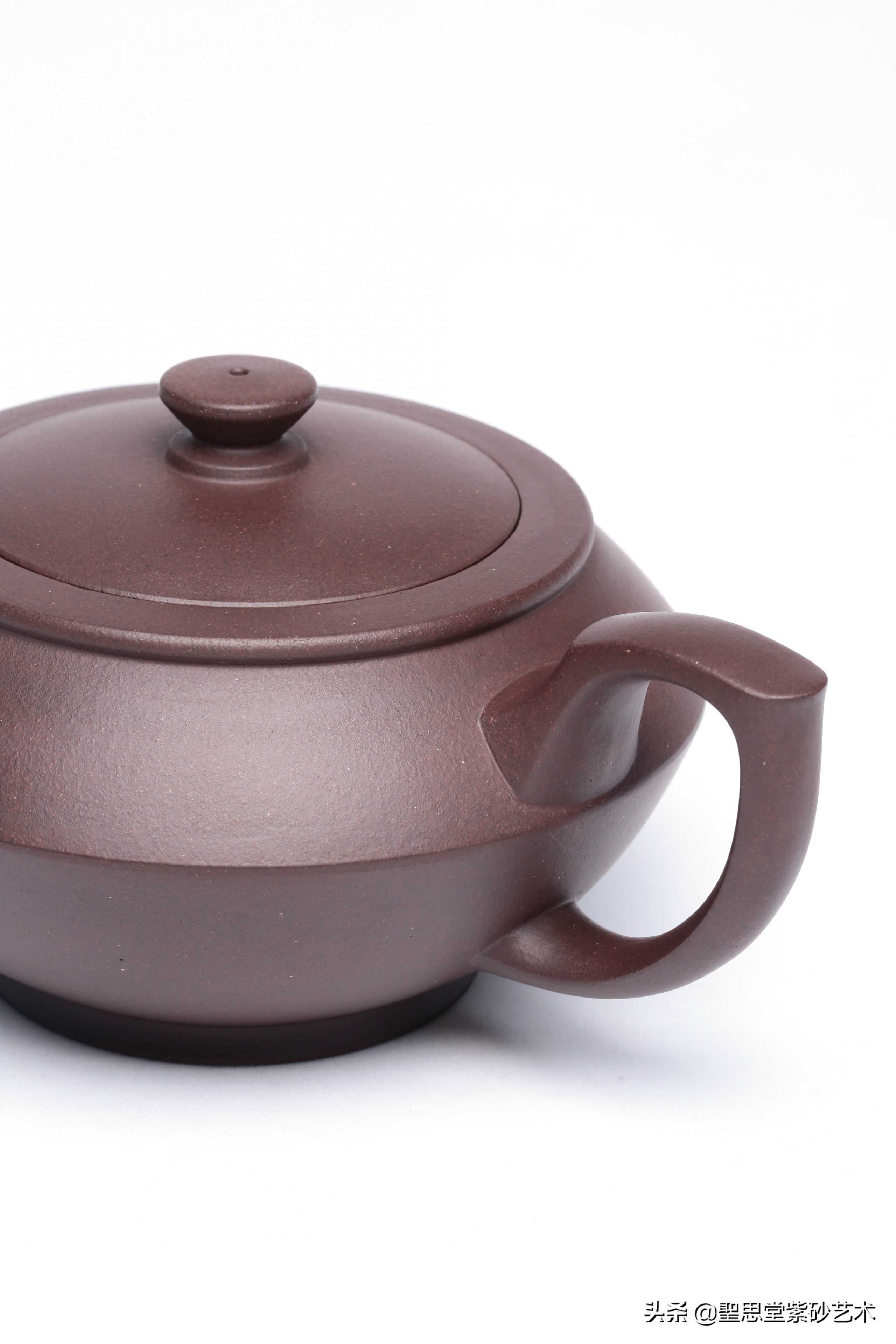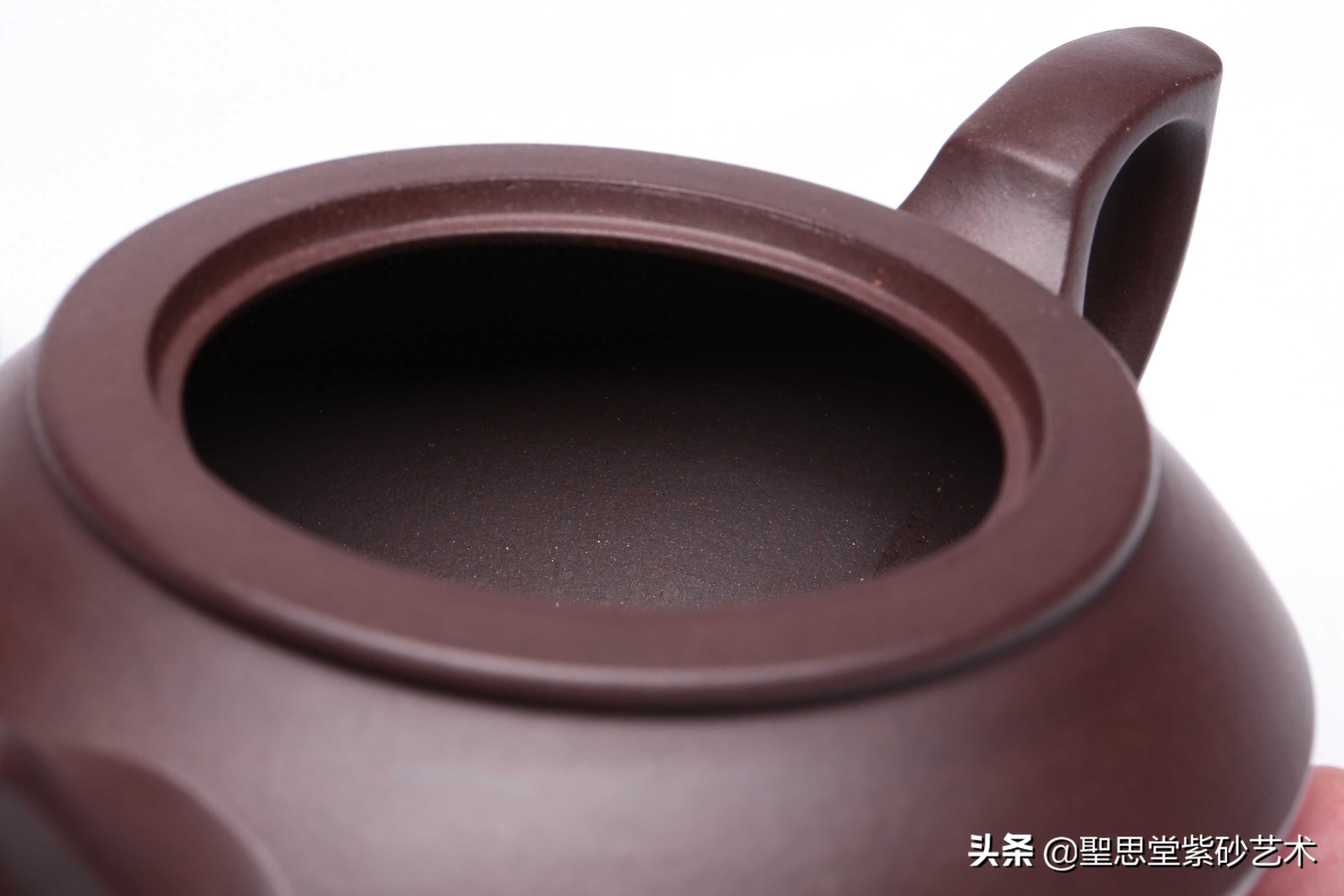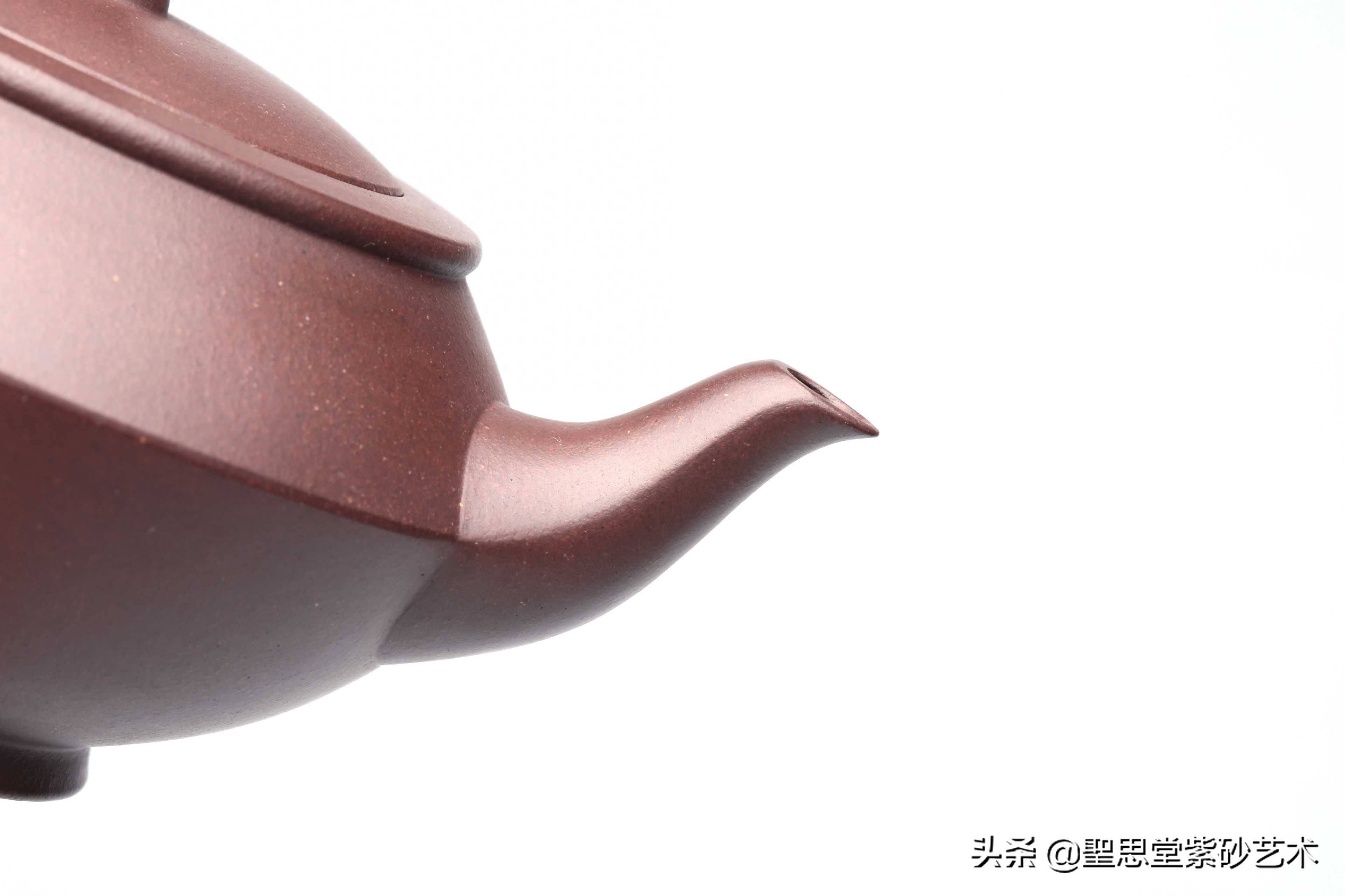 壶做工精细,平底起棱,呈圈足状,稳重又大气。三弯的壶嘴略长,出水流畅。敞口,平沿。