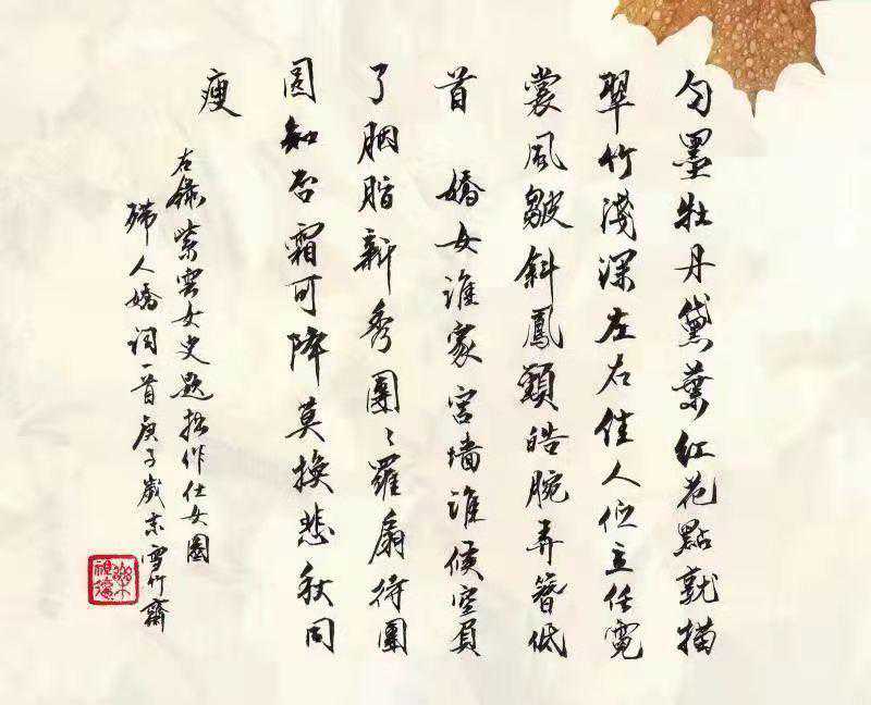 匀墨牡丹,黛叶红花点就。描翠竹、浅深左右。佳人伫立,任霓裳风皱。斜凤颈、皓腕弄簪低首。