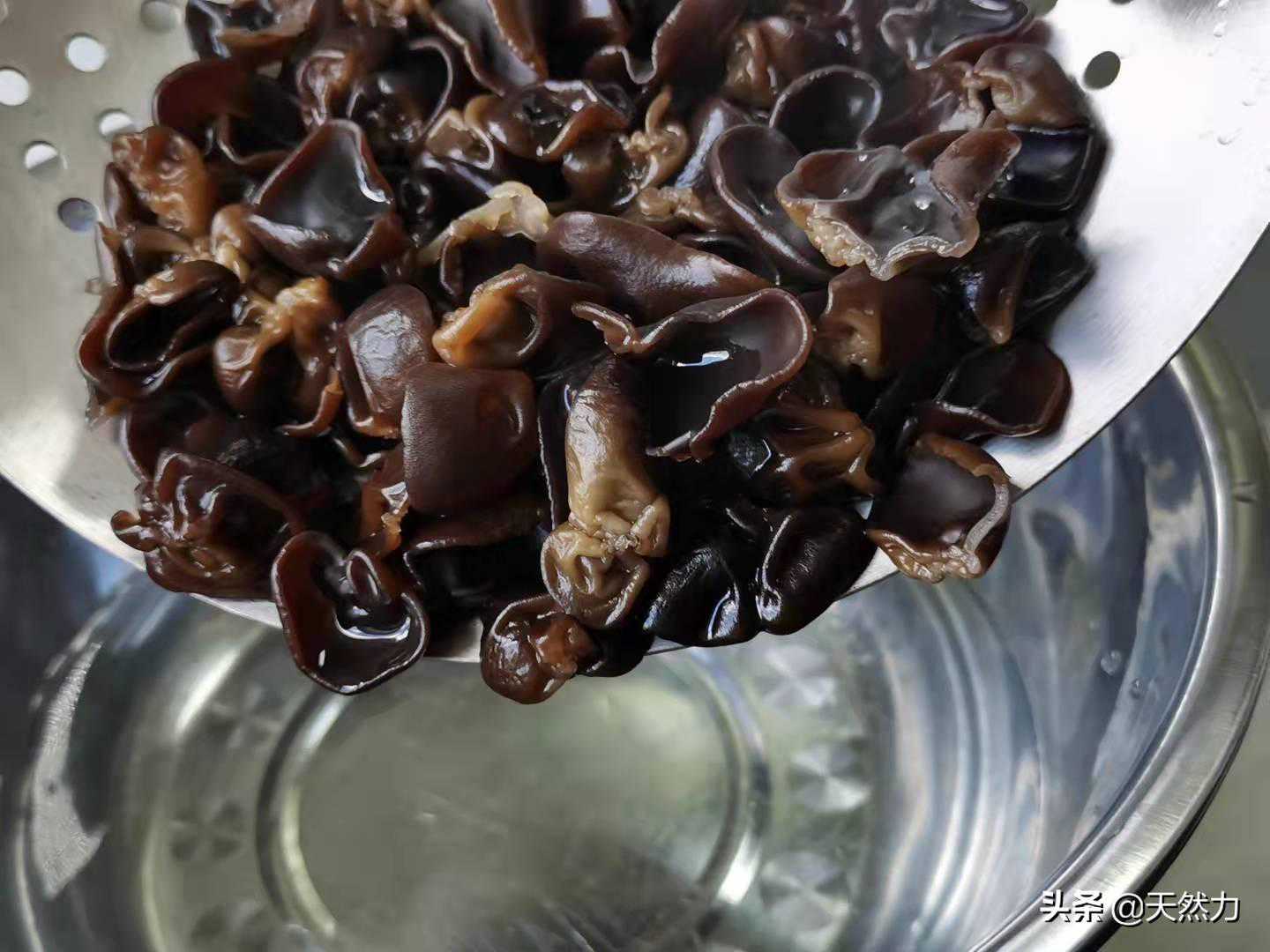5、泡发黑木耳一定要用冷水来泡,只有用冷水泡发出来的黑木耳的口感才脆爽有嚼劲,泡发的时间有60分钟就够了。