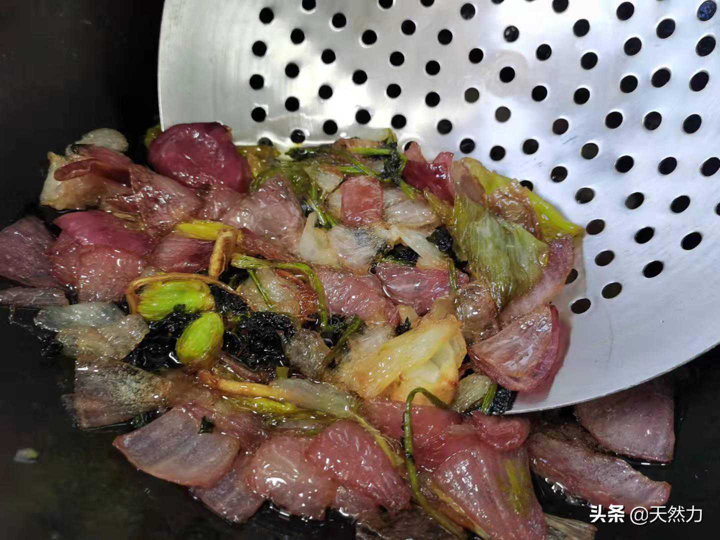 5、捞起后用勺子多压一下,把里面的油挤压出来。本着不浪费的原则,这些料渣呢可以用来做配料用来炒菜也是非常不错的。