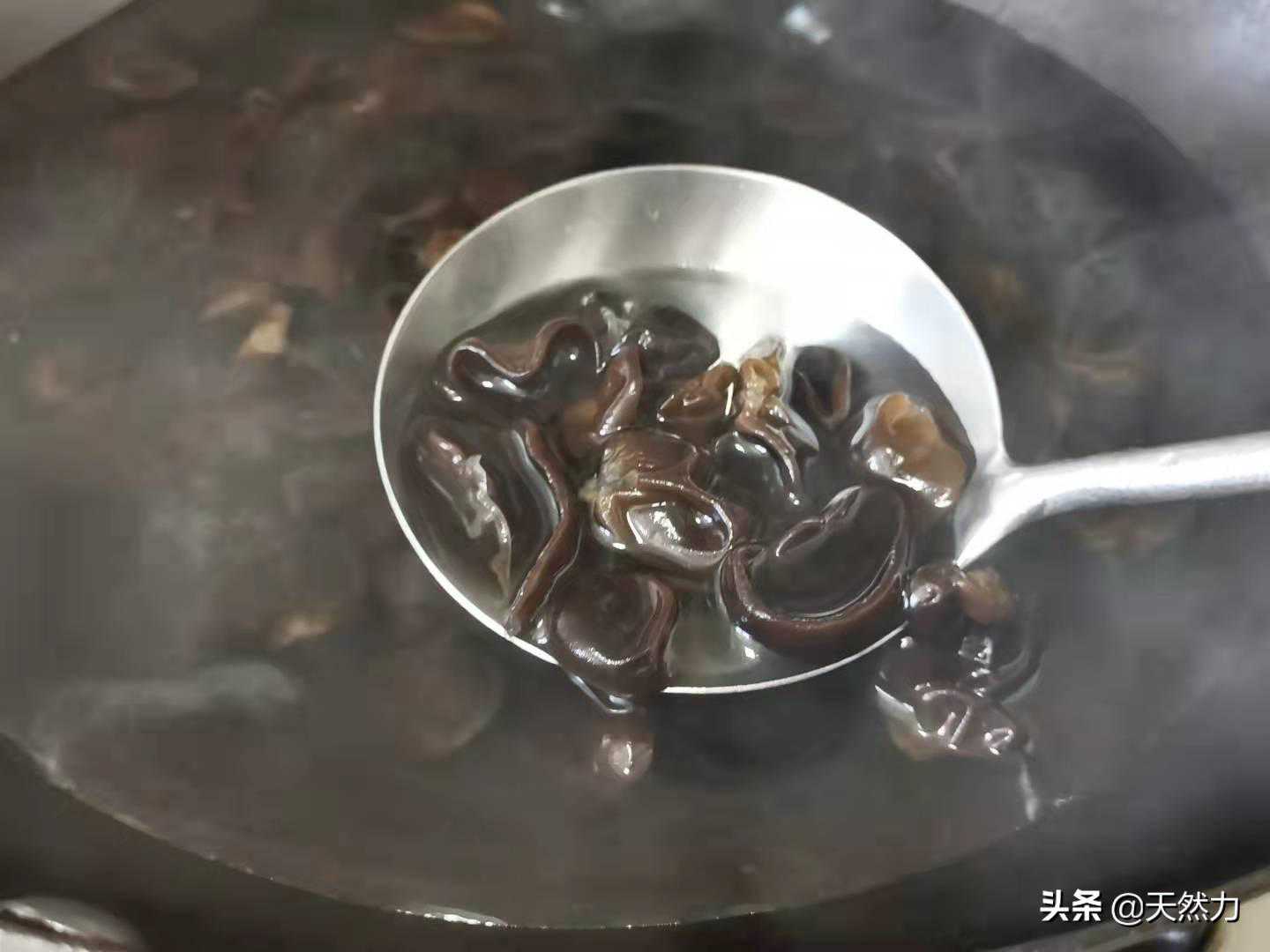 8、黑木耳是菌类,为了食用安全,所以一定要高温消毒把它煮熟才能食用,否则很容易引起肠胃不适。黑木耳是一种易熟的食材,等水再次沸腾后开始计时30秒即可捞起出锅,这过程中要多翻动几下,使其受热更均匀。