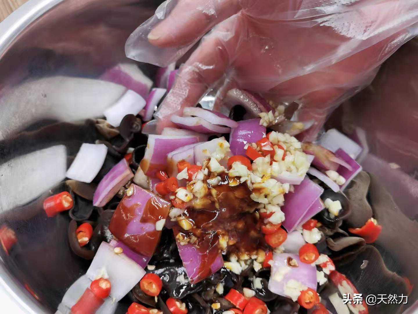 19、全部添加完毕后戴上手套,把所有的食材和调料充分地搅拌均匀。