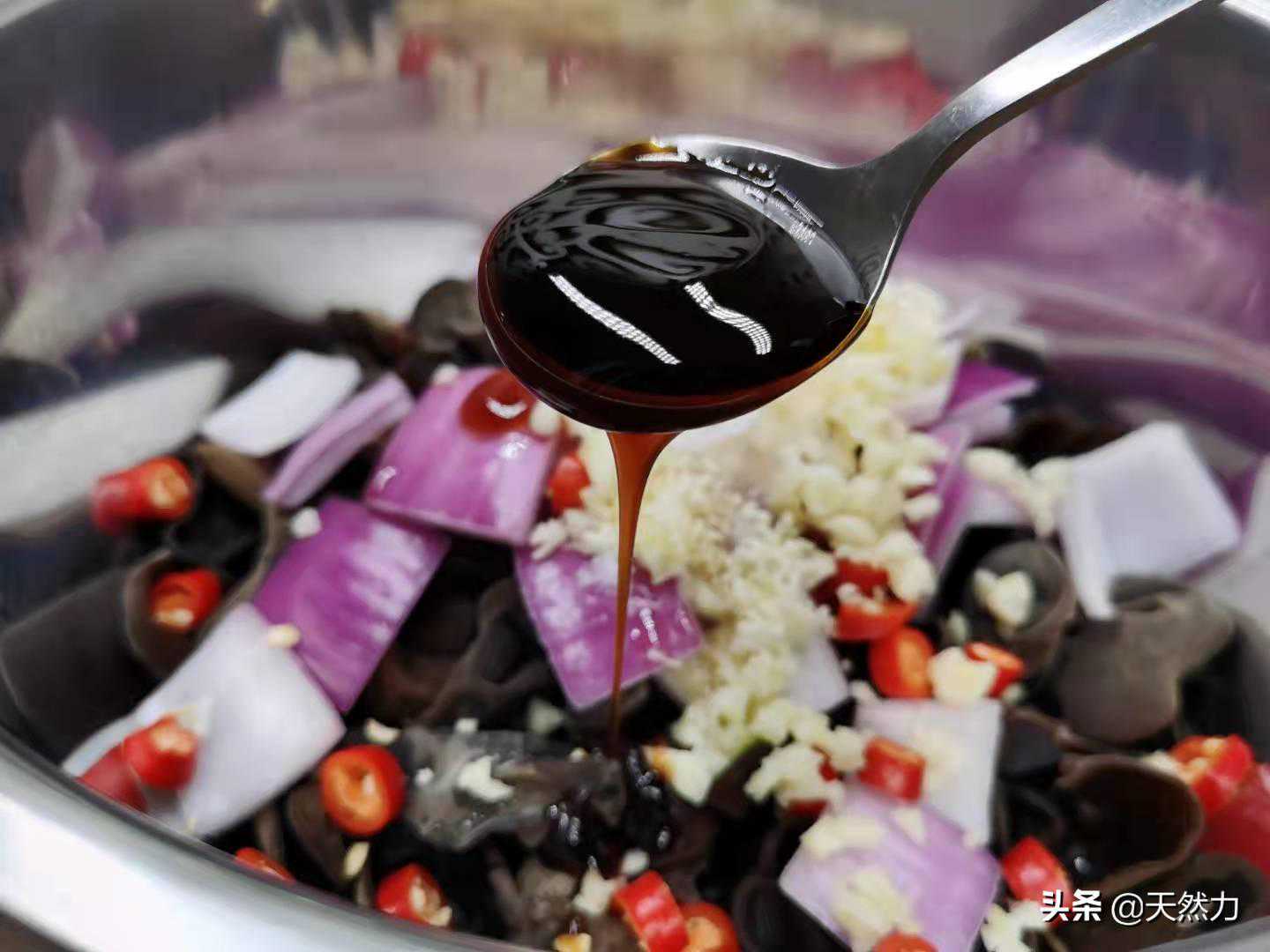 16、加入10克蚝油增味增鲜,加蚝油还有另外一个目的,因为黑木耳和洋葱的表皮都比较光滑,而蚝油比较浓稠,具有一定的吸附能力,可以把其它的调味料更好的黏附在食材的上面。