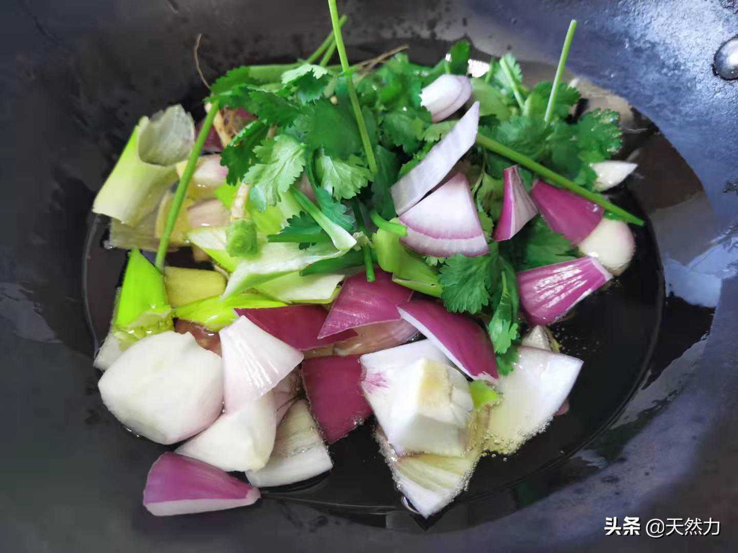 2、接下来我们就要来炼一个葱油,这个葱油可以用来早餐的粉面,炒菜时用,那都可以直线拉升你菜肴的味道,锅内加油后把香菜、洋葱和大葱倒进锅内,把食材中的水分熬干,把香气融入到油中。