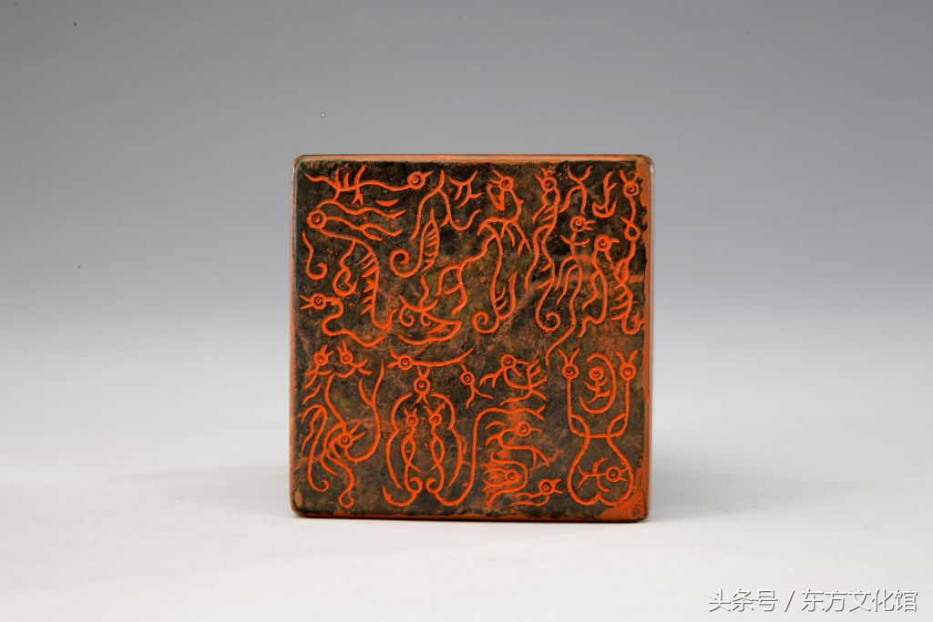此宝周边满刻浅浮雕夔龙及博古纹饰,上部雕夔龙出没于云间,体态生动,其质地与四边纹饰、纽雕等都与康熙朝晚期的寿山石印章风格一致,说明此玺是嘉庆时利用宫中收藏的旧宝改刻的。这也是帝后宝玺制作过程中的正常现象。