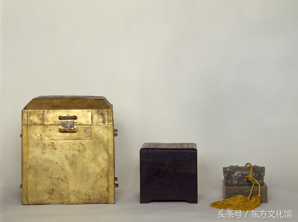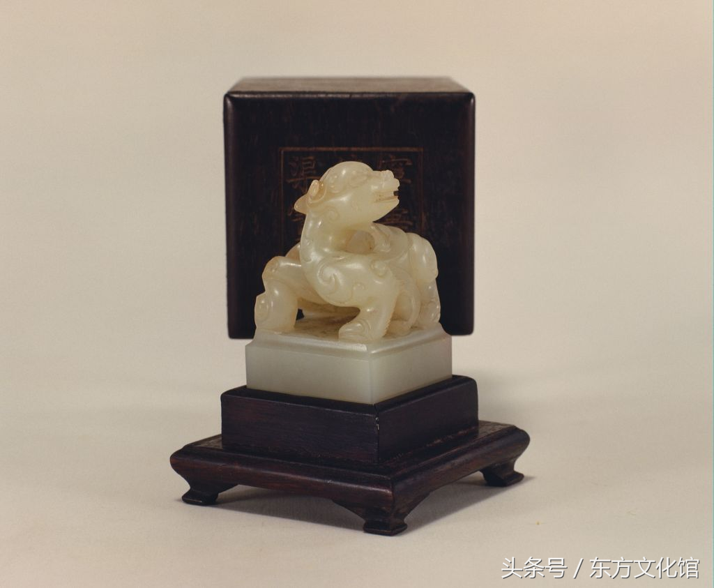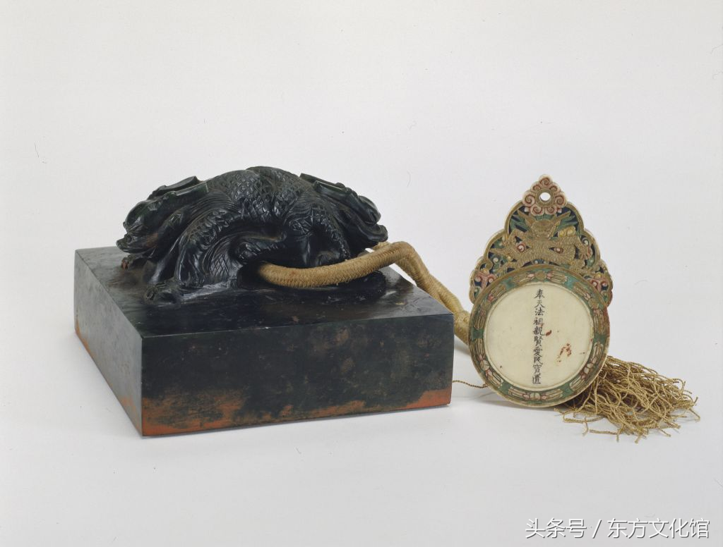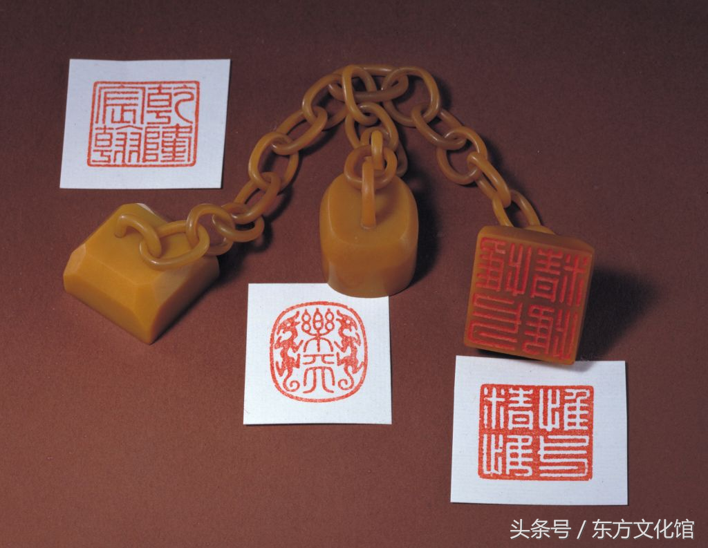同治帝宝玺。此宝用一块水晶雕制,尤其是桥纽及连环,雕刻难度很大,不易成型,故十分难得。此宝曾钤于慈安皇太后、慈禧太后《行乐图》以及咸丰帝定陵神道碑之上。
