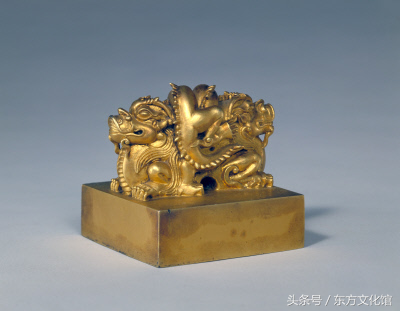 “珣皇贵妃之宝”,清宣统,金质,蹲龙纽方形玺,满汉文篆书。面13cm见方,通高12.8cm,纽高4.1cm。