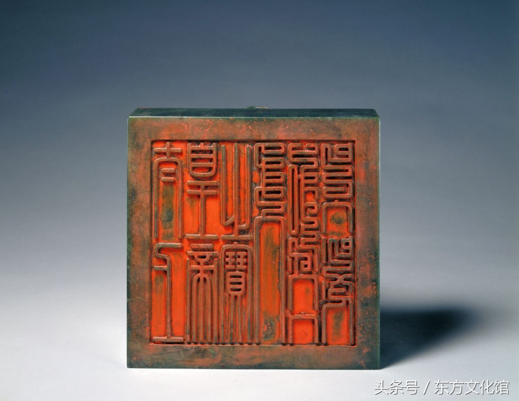 “十全老人之宝”,清乾隆,碧玉质,交龙纽方形玺,汉文篆书。面12.8cm见方,通高15.3cm,纽高5.4cm。