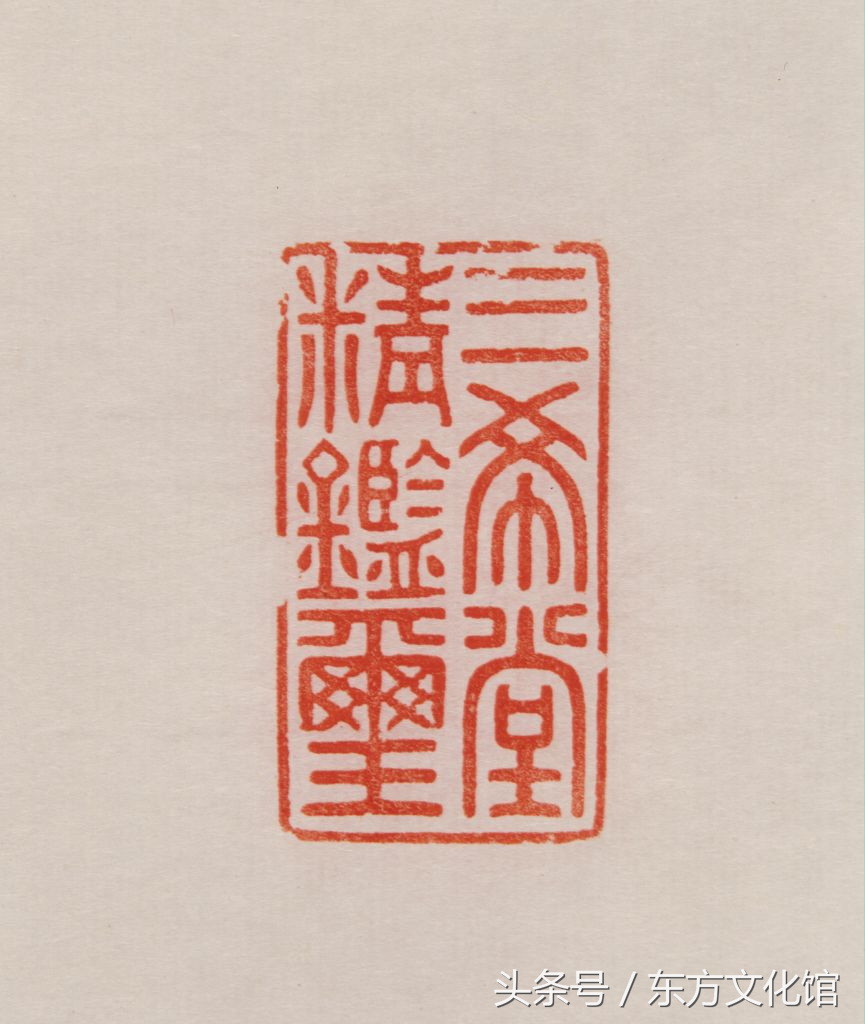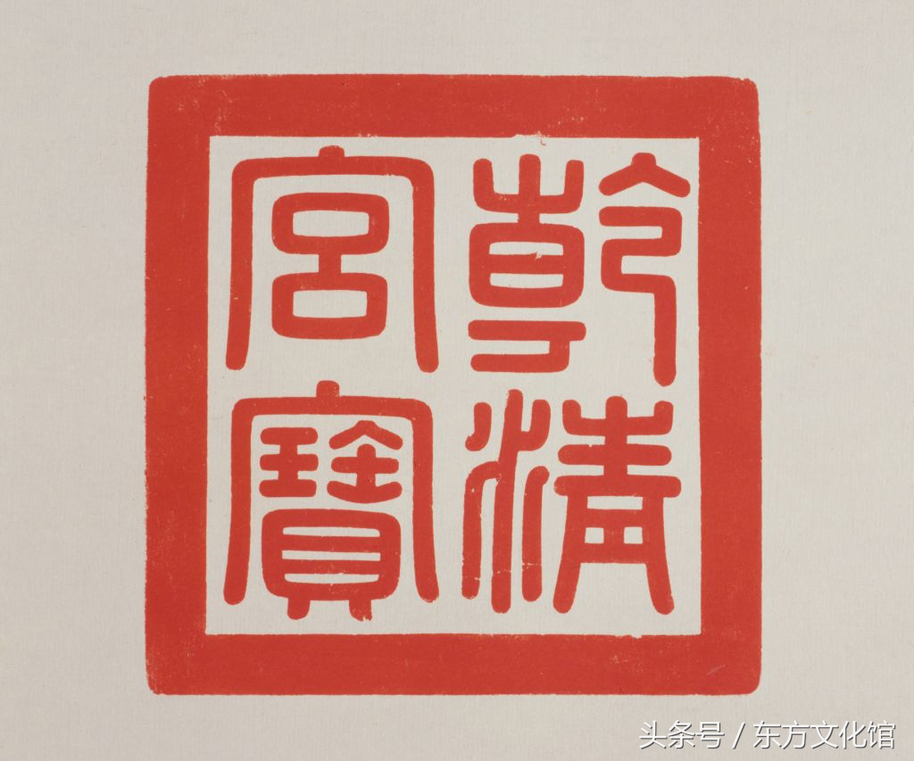 三希堂,在紫禁城内养心殿西暖阁,因这里藏有稀世之珍的王羲之《快雪时晴帖》、王献之《中秋帖》、王珣《伯远帖》而得名。从艺术鉴赏角度看,“三希堂”便成为著名艺术品的典藏地而闻名于世,与之相对应的“三希堂精鉴玺”和“宜子孙”玺便当然成为鉴定性标志。二玺主要钤盖于《石渠宝笈》、《秘殿珠林》初、续编著录过的书画作品之上,具体使用情况在《石渠宝笈》、《秘殿珠林》初、续编的“凡例”中有明确说明。如《石渠宝笈》初编,凡书画分贮乾清宫、养心殿、重华宫、御书房四处,俱各用鉴藏玺以别之,又“石渠宝笈”、“乾隆御览之宝”二玺,册、卷、轴皆同。上等者则盖以“乾隆鉴赏”、“三希堂精鉴玺”、“宜子孙”三玺。而《石渠宝笈》、《秘殿珠林》续编入选者,则钤用“乾隆御览之宝”、“乾隆鉴赏”、“三希堂精鉴玺”、“宜子孙”、“秘殿珠林”或“石渠宝笈”、“秘殿新编”或“珠林重定”、“石渠宝鉴”或“宝笈重编”。而这两方玺在钤盖时的位置也基本固定,一般都在作品的右下方,且“三希堂精鉴玺”在上,“宜子孙”玺在下。
