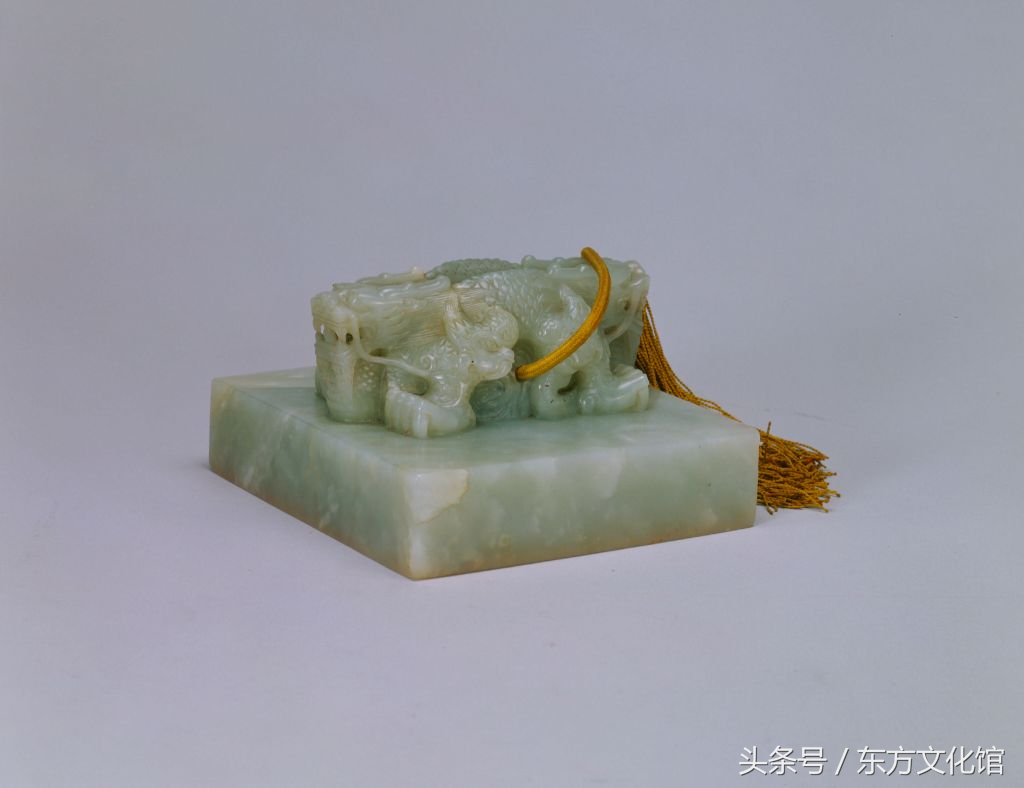 碧玉龙纽“武功十全之宝”,清乾隆,高9.6cm,方12.9cm。清宫旧藏。