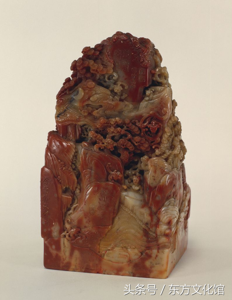 “嘉庆御览之宝”,清嘉庆,寿山石质,随形雕山水小景长方形玺,汉文篆书。面长4.3cm,宽3.1cm,通高8.5cm。