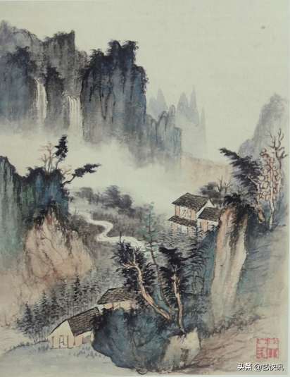 1.勾加皴,有创新。纵观古代青绿山水画,基本用的是张僧繇没骨法,就连近代的张大千、郑昶、祁崑等人亦不例外。他们在画青绿山水时先勾轮廓,后填青绿,不加皴点或少加皴点。但萧趣却用元人笔法,画宋人丘壑,敦唐人色彩,勾、皴、点、染并举,所作青绿山水既有唐人之富贵,又有宋人之严整,也有元人之逸趣。虽源于传统,又有创新。