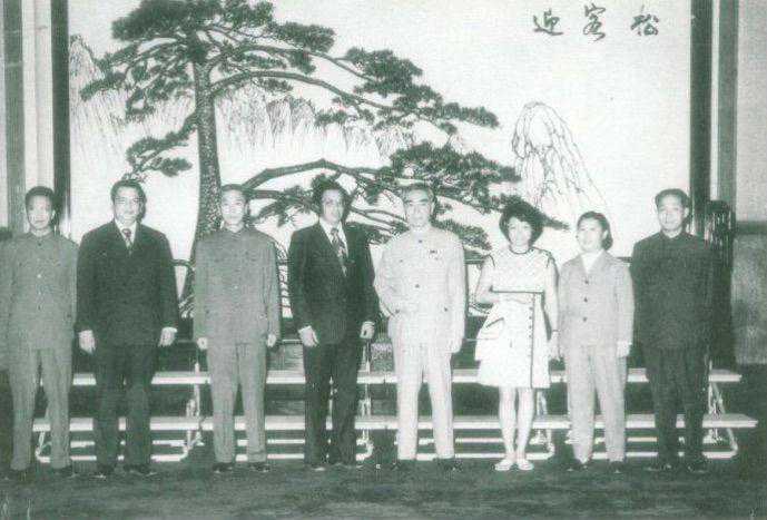 周总理与外宾在人民大会堂迎客松屏风前合影