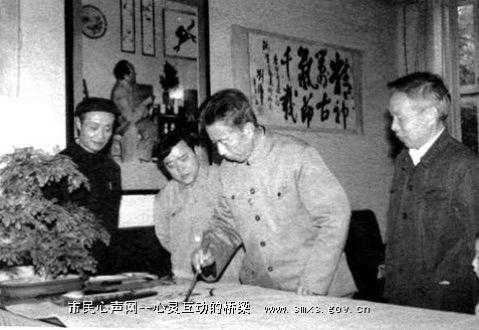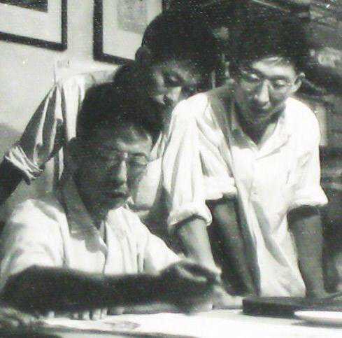 这是王石岑在工艺美术厂作画。右一是工艺美术大师杨光辉、右二作画者是王石岑先生、其它两人是当时的王厂长与书记。