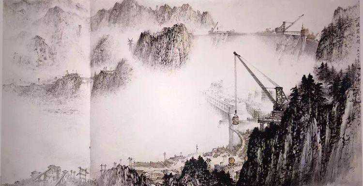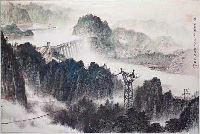 这是王石岑在创作大型壁画巜梅岭初晴》,这幅壁画长期悬挂在合肥骆岗机场,该画气势恢弘,震撼心灵。现收藏在安徽机场管理局的大型保险库。梅岭初晴》作品中,体现其对自然的描绘,融入了对人类创造力的歌颂。画面中高峡平湖,群峰环抱。雄伟壮观的人造水库大坝,隐显于深山茂林中的水电站,耸立云天的高压电线架……真实而朦胧,其诗意般的浪漫主义情调,组成一部人定胜天的交响曲!反映出社会主义建设事业的蒸蒸日上,歌颂了人民战天斗地的精神风貌。