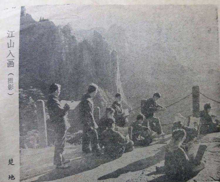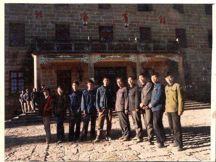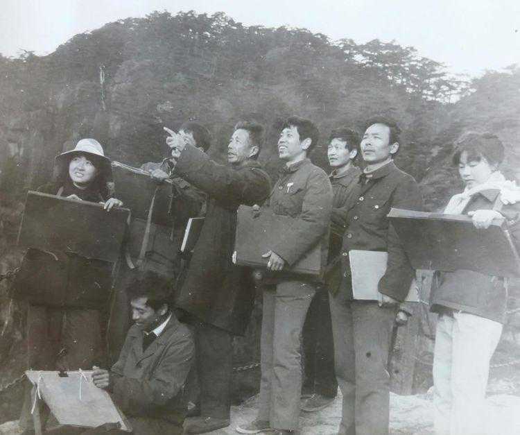 这是1980年王石岑带领77届学生上黄山写生时所拍。最左女的是黃少华(合师院),遮住的是吴同彦(安师大),王老后一为陈亚飞(宁波大学),后二为罗太保(铜陵一中),后三为李锦胜,后四女的为李惠珍(不详),前下面一位是鲍诗度(东华大学)感谢李锦胜教授提供的照片,李锦胜教授当时已是带课教师。