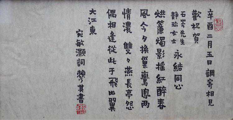 这是由著名学者宛敏灝作词赖少其书写的,赠送王石岑新婚的贺礼。作品中的主人公王石岑,词的作者宛敏灝,书法作者赖少其都是当代著名人物。其价值无法估量。从中可以看出他们的友谊无比珍贵。