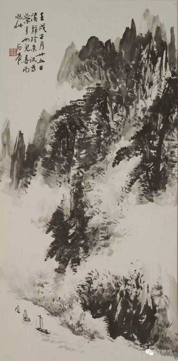 点帆楼是王石岑画室名,意指用手中的画笔把祖国的河山装点的绚丽多彩,用片片白帆放飞理想,充满了主人的浪漫情怀和诗意的寄托。王石岑先生在点帆楼里创作了无数优秀作品,其中包括《黄山》巜黄山疗养院》《青溪归牧》《地上天河》巜关山万里图》《晓雾初开》《山村秋夜》《梅山水库》并入选全国美展。其中《晓雾初开》曾在意大利等国展出,巜黄山百丈泉》由文化部推荐在美国加尼福尼亚州展出,《望岳渡千山》陈列于中国驻法国大使馆,《九华天台》入选大型画册巜长江》,竖2.5米、横4.5米的巨幅国画《迎客松》,以其为样本制作的铁画迎客松至今陈列于北京人民大会堂,以及巨幅壁画《梅岭初晴》《群峰竞秀》长期悬挂在合肥骆岗国际机场候机大厅。今天我们观王石岑先生的山水画,品读王石岑先生的诗文,从他的作品中感悟山水精神和人文精神。王石岑先生的艺术将世代相传,将给人们留下不可磨灭的记忆。