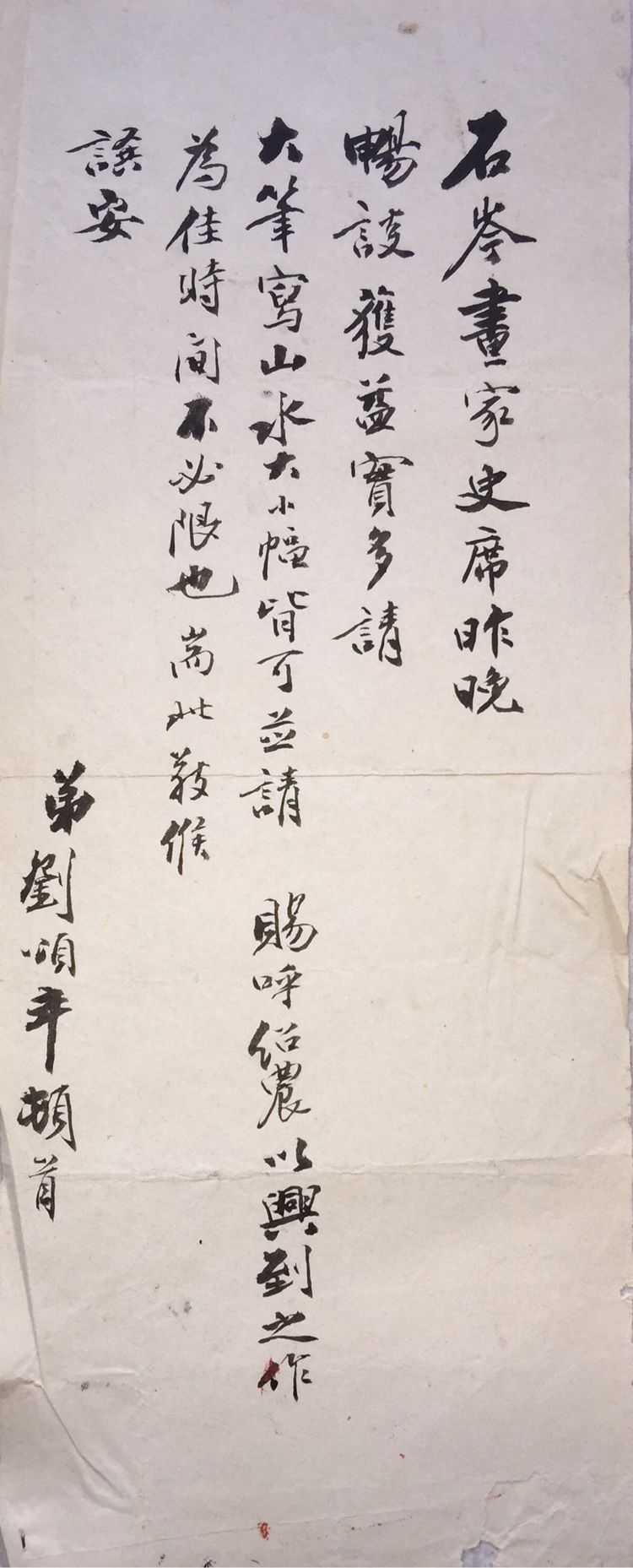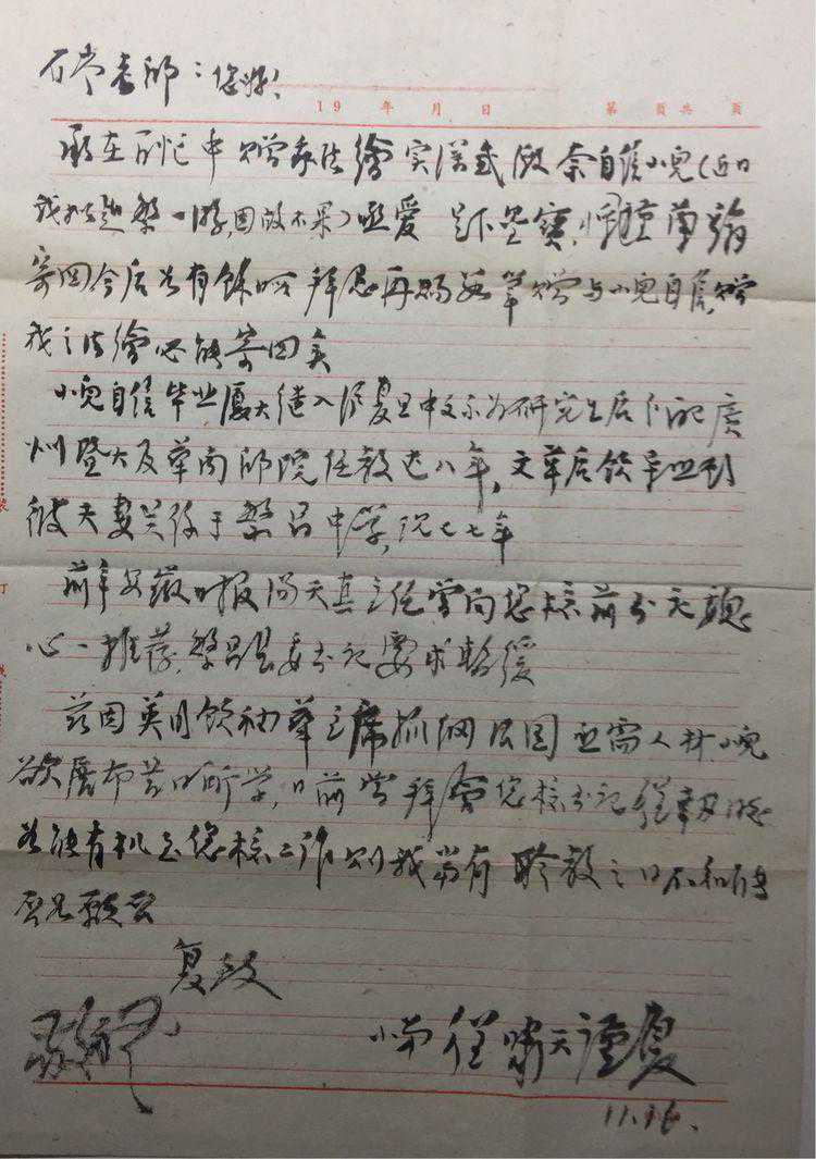这封是黄宾虹大弟子程啸天写给王石岑的亲笔信。这时候文革刚过,各项知识分子的政策还没落实,信中叙述了两人的友情及思念之情,另外委托王石岑帮助其子安排工作。王石岑如实向赖少其汇报,后来其子被安排到省内一著名大学工作。