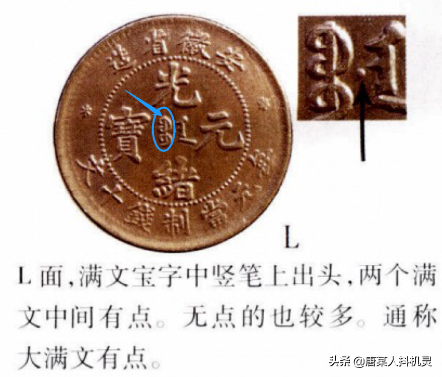 L面,大满文。上文:安徽省造;中文:光绪元宝;中满文:宝安;下文:每元当制钱十文;左右:小边花。特征:满文宝上出头。