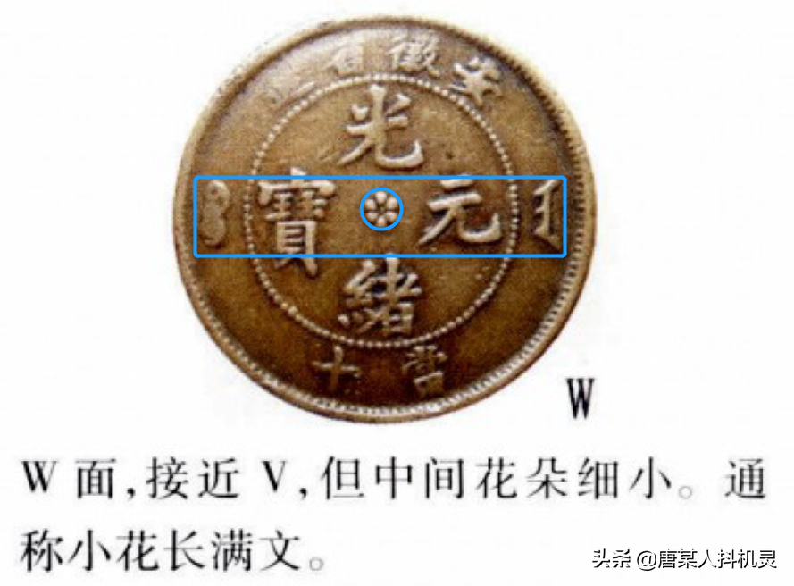 W面,小花长满文。上文:安徽省造;中文:光绪元宝;中花:阳点六瓣花;下文:当十;左右:满文宝安。特征:中花较小,满文粗长。