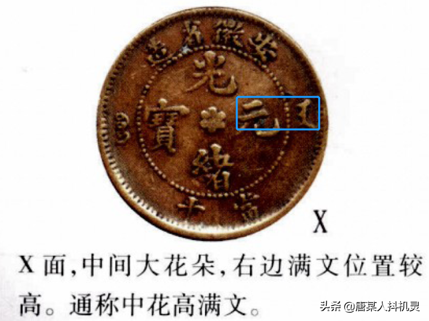 X面,中花高满文。上文:安徽省造;中文:光绪元宝;中花:阳点六瓣花;下文:当十;左右:满文宝安。特征:右满文位置与元字基本持平。