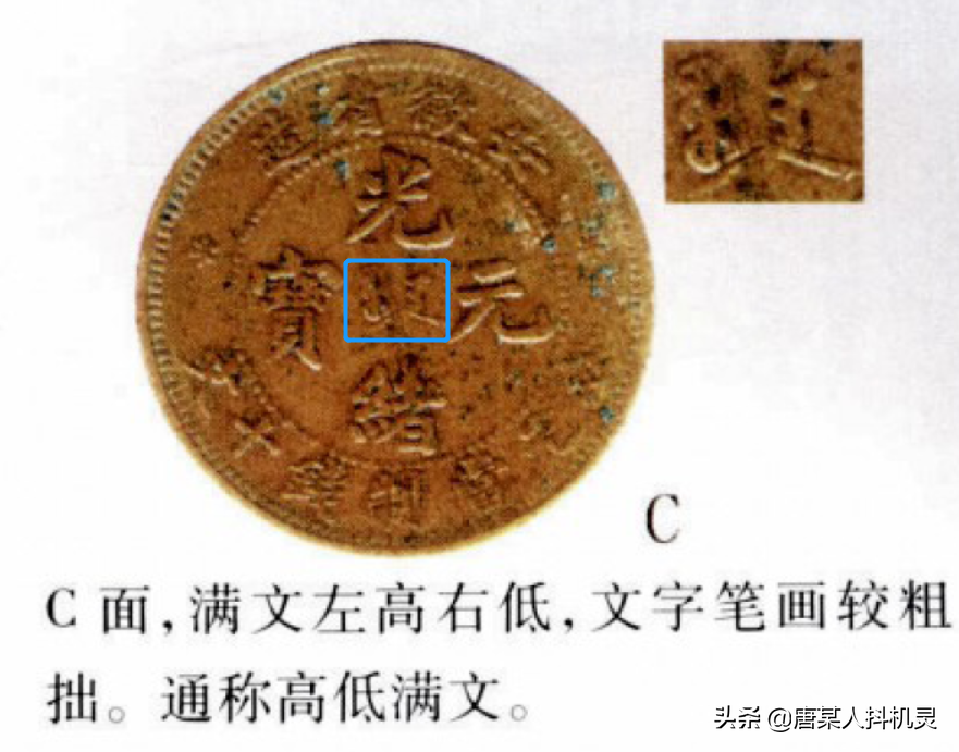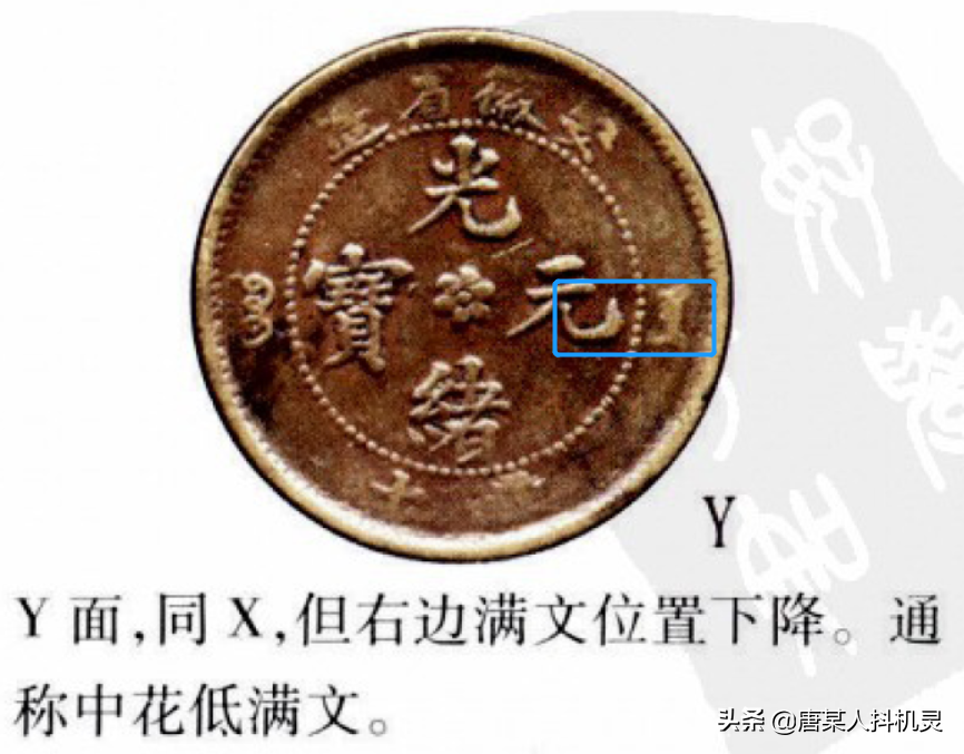 Y面,中花低满文。上文:安徽省造;中文:光绪元宝;中花:阳点六瓣花;下文:当十;左右:满文宝安。特征:右满文位置低于元字。