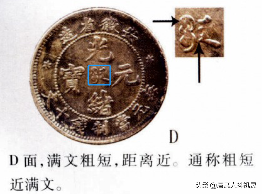 D面,粗短近满文。上文:安徽省造;中文:光绪元宝;中满文:宝安;下文:每元当制钱十文;左右:小边花。特征:中间满文粗短且贴紧。