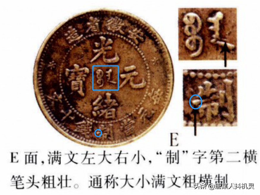 E面,大小满文粗横制。上文:安徽省造;中文:光绪元宝;中满文:宝安;下文:每元当制钱十文;左右:小边花。特征:中间满文左大右小,制字第二横笔头粗。