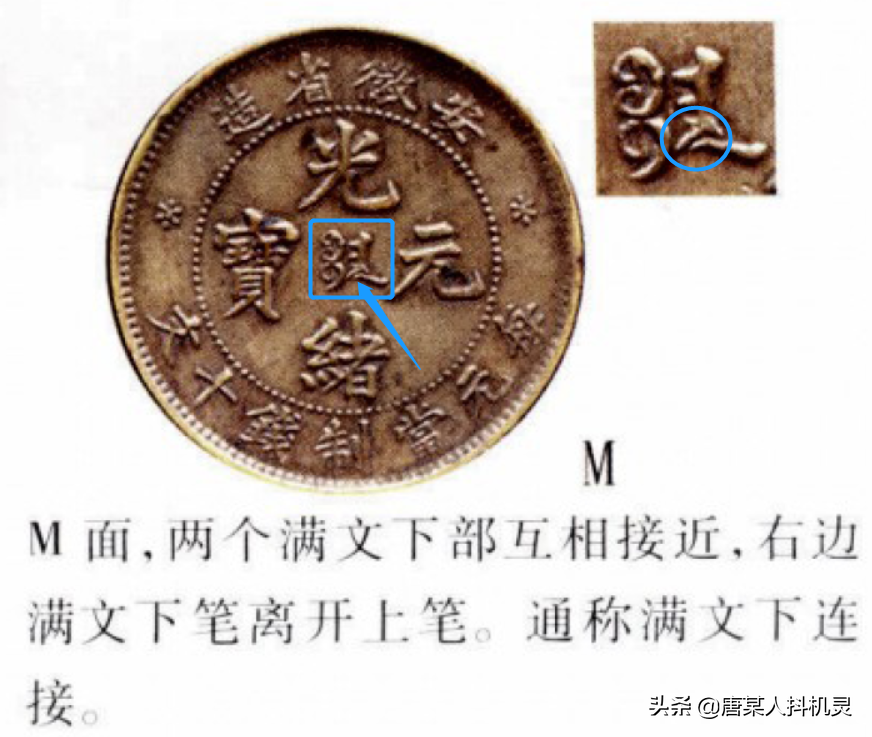 M面,满文下连接。上文:安徽省造;中文:光绪元宝;中满文:宝安;下文:每元当制钱十文;左右:边花。特征:满文安尾笔独立不连接。