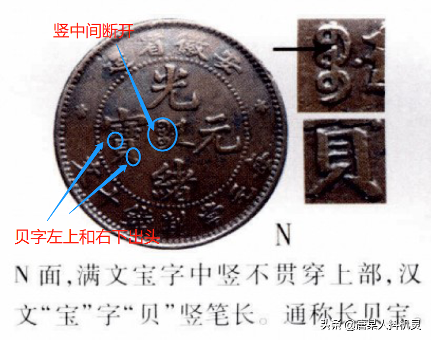 N面,长贝宝。上文:安徽省造;中文:光绪元宝;中满文:宝安;下文:每元当制钱十文;左右:边花。特征:满文宝中竖不连贯,宝下贝字左上和右下均出头。