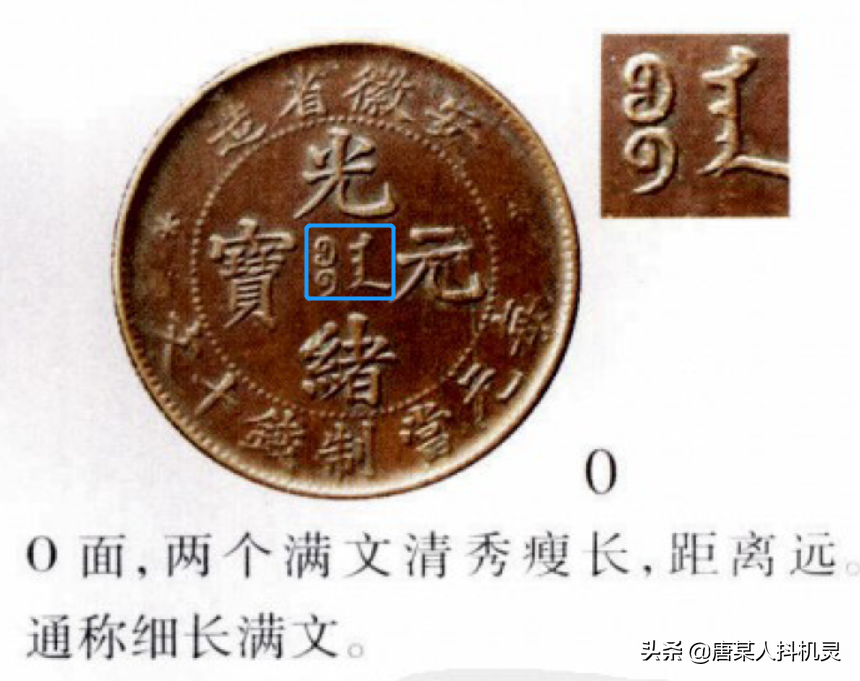 O面,细长满文。上文:安徽省造;中文:光绪元宝;中满文:宝安;下文:每元当制钱十文;左右:小边花。特征:满文细长中距较宽。