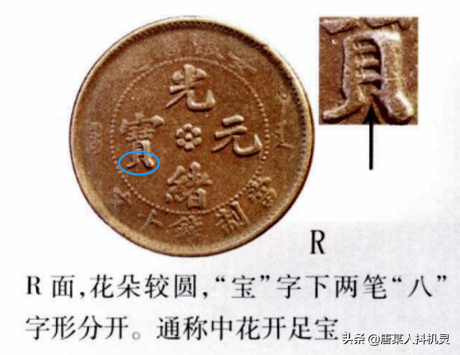 R面,中花开足宝。上文:安徽省造;中文:光绪元宝;中花:阳点六瓣花;下文:当制钱十文;左右:满文宝安。特征:宝字下两点分开,左边一点差异巨大。