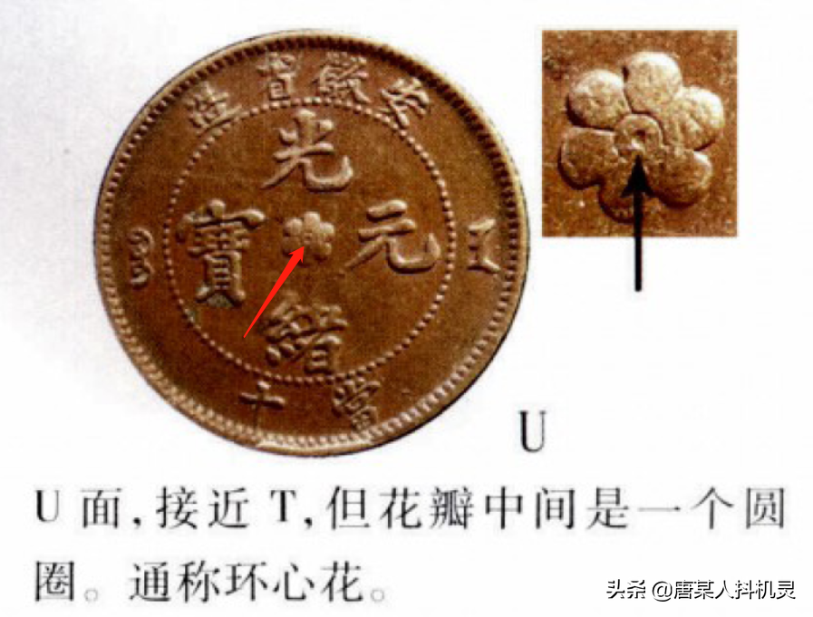 U面,环心花。上文:安徽省造;中文:光绪元宝;中花:六瓣花中间为环型;下文:当十;左右:满文宝安。特征:中花中间为环形。