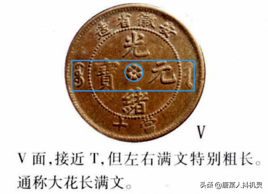 V面,大花长满文。上文:安徽省造;中文:光绪元宝;中花:阳点六瓣花;下文:当十;左右:满文宝安。特征:中花较大,满文粗长。