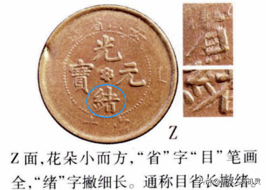 Z面,目省长撇绪。上文:安徽省造;中文:光绪元宝;中花:阳点六瓣花;下文:当十;左右:满文宝安。特征:中花较方,省字下为目,绪字撇笔细长。