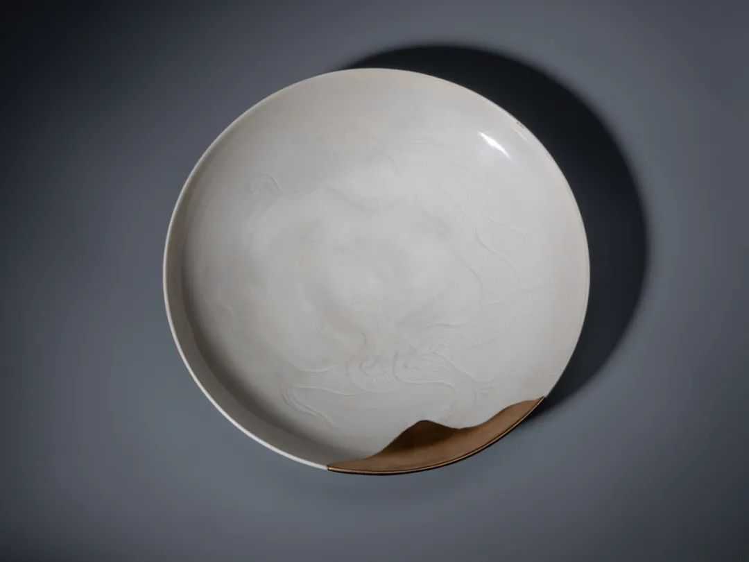 此器形制规整古朴,圆口敛腹,浅足微高,内外均施象牙色白釉。盘心刻划龙纹,刀工古朴雅致,不见滞涩,龙身轮廓线外另加复线以增强立体感,盘龙全身披鳞挂甲,龙有三爪,体态矫健,昂首张口,双目圆睁,其技艺之高,丝毫不逊于同期书画之极精品者。而盘内壁留白,意在突出盘心龙纹,故整体观之,愈见精妙。