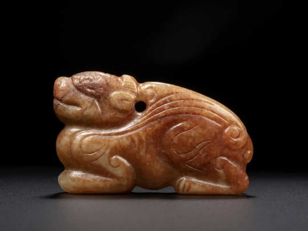 此佩为青黄玉雕琢而成,沁色深浅不一,玉质上乘,色泽醇厚。通体以阴线刻画出瑞兽形态,精巧可爱,立体感十足。自古以来,瑞兽是祥瑞的代表,可护佑平安、辟邪消灾。背部有穿孔,既可手持把玩,又可佩戴于身。