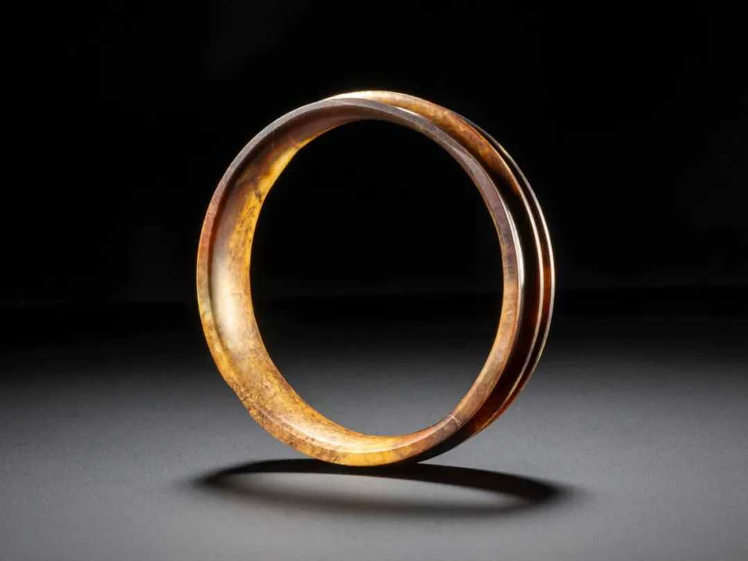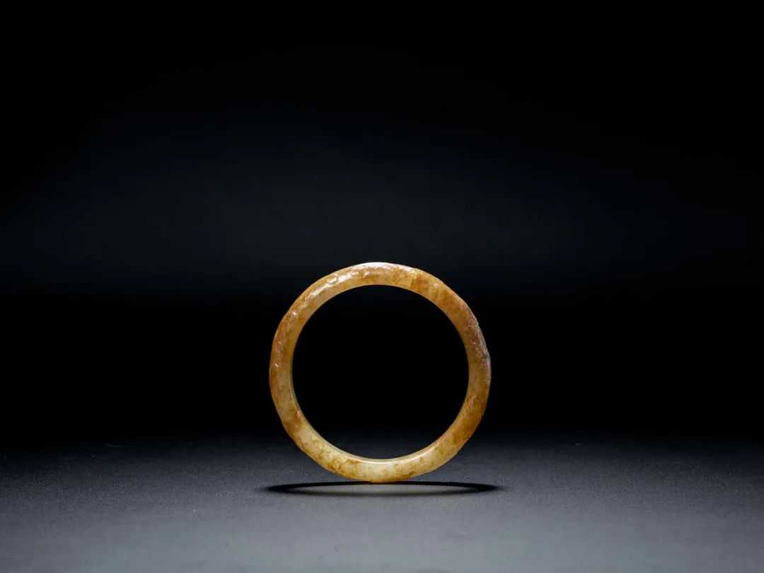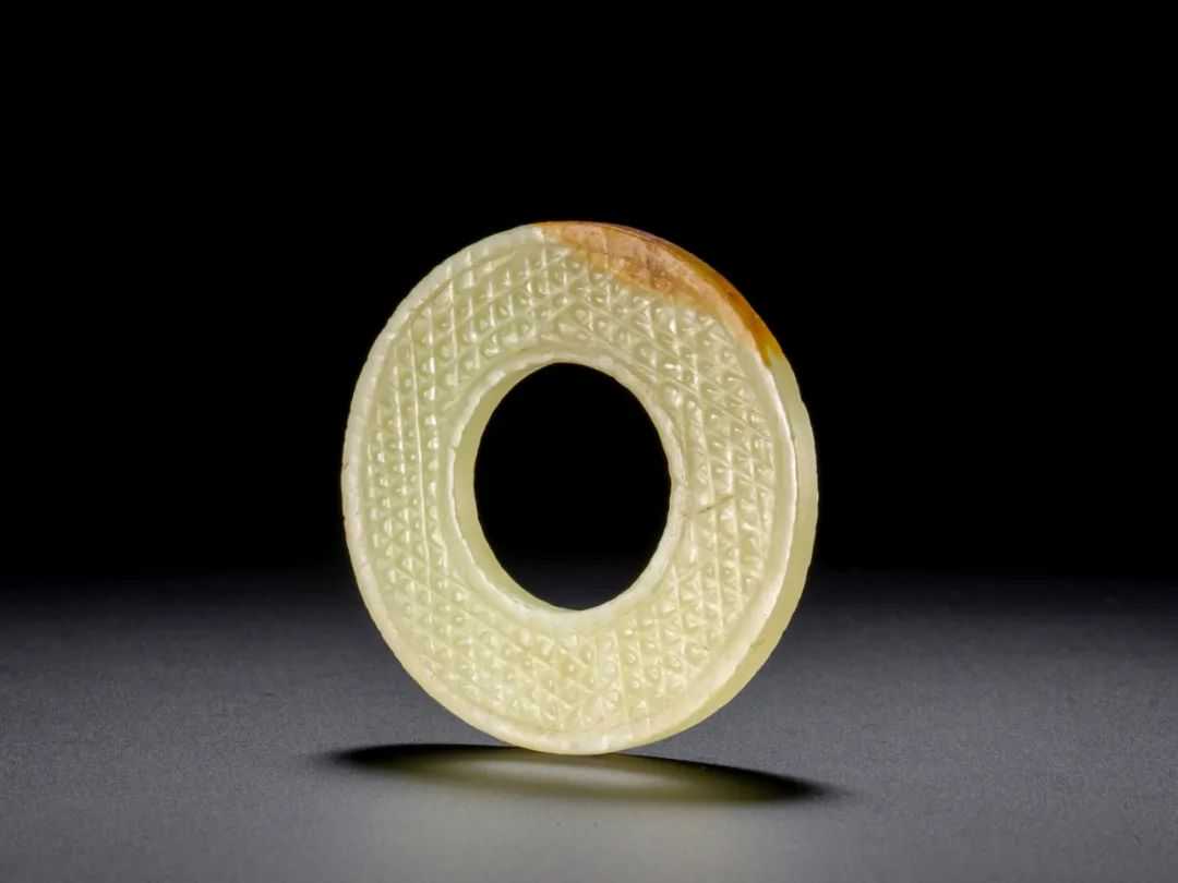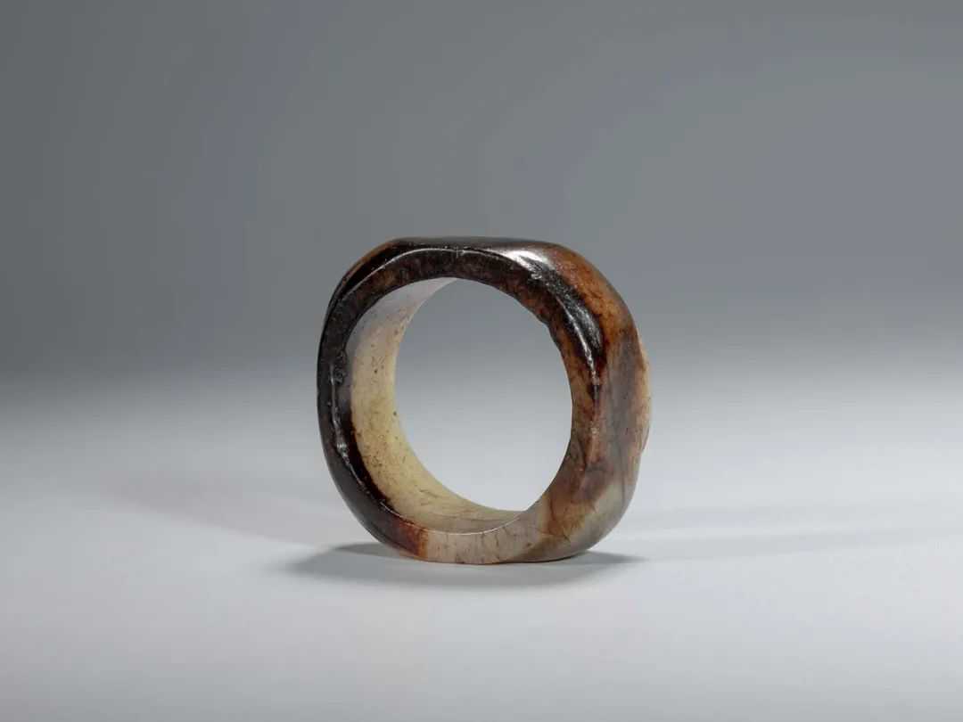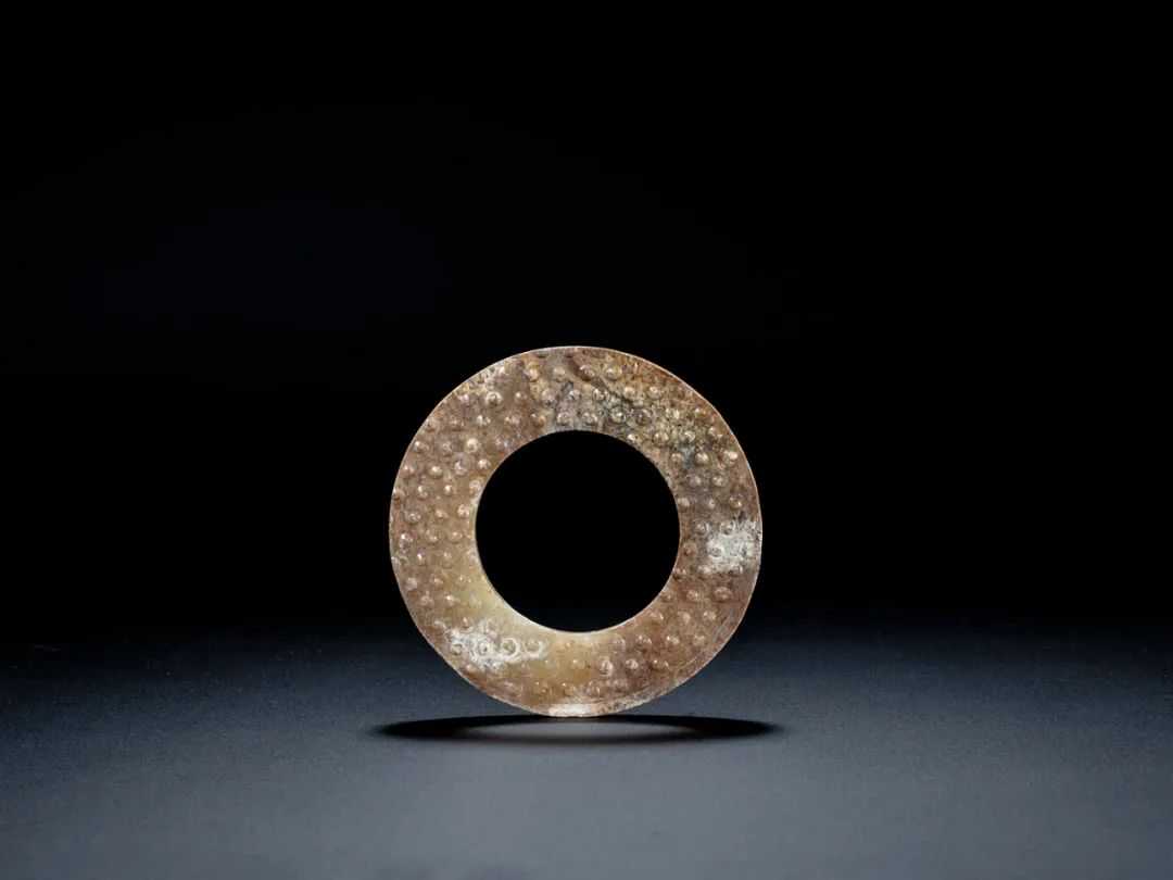 此器外缘三道弦纹环绕,内缘打磨平滑。周身受沁,呈色斑斓,经历代藏家盘玩摩挲,色泽温和古雅。