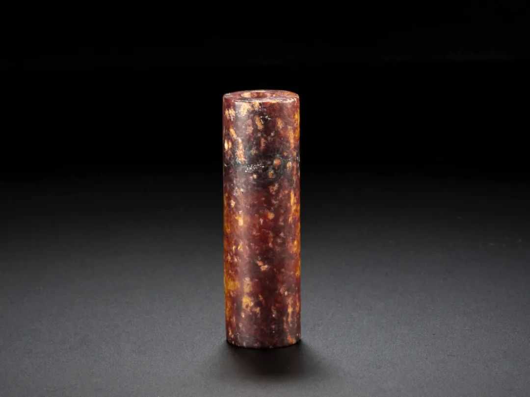 素面玉勒,呈形态饱满的圆柱形,通天孔贯穿,玉料致密莹润,质地细腻,受红褐沁,古朴雅致,古韵悠然。