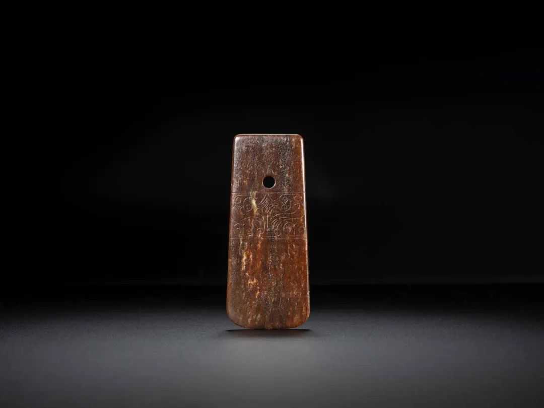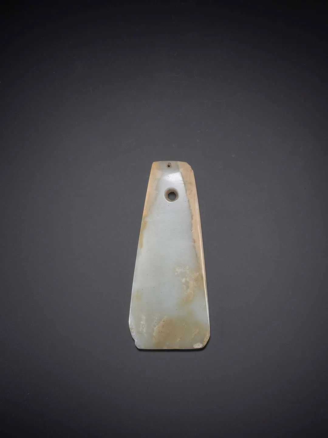 玉斧扁平长条梯形,切割规整,器体底部出刃。上端近肩正中处一钻孔,孔内壁平直。孔下装饰饕餮纹。器身满沁,黑沁与褐色沁交织,造型朴拙,苍古高远。