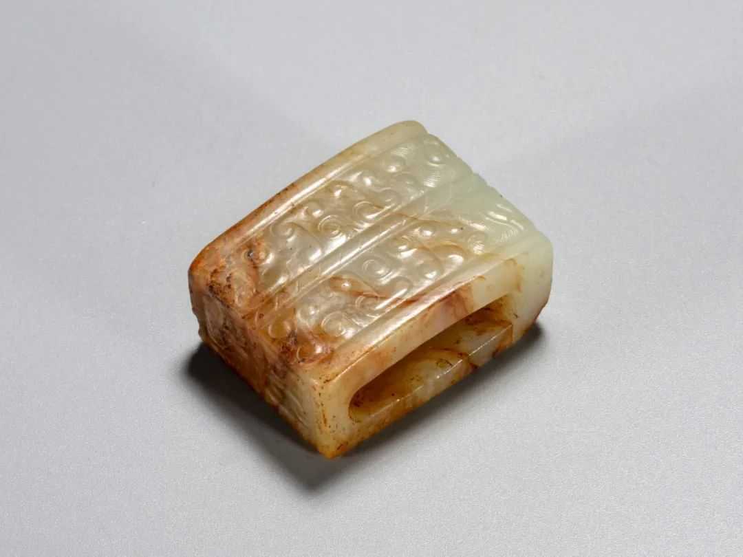剑璏为白玉质,玉质温润,造型古朴,局部受红褐色沁。整体呈长方形,浮雕云龙纹,雕刻精细,古朴大气。