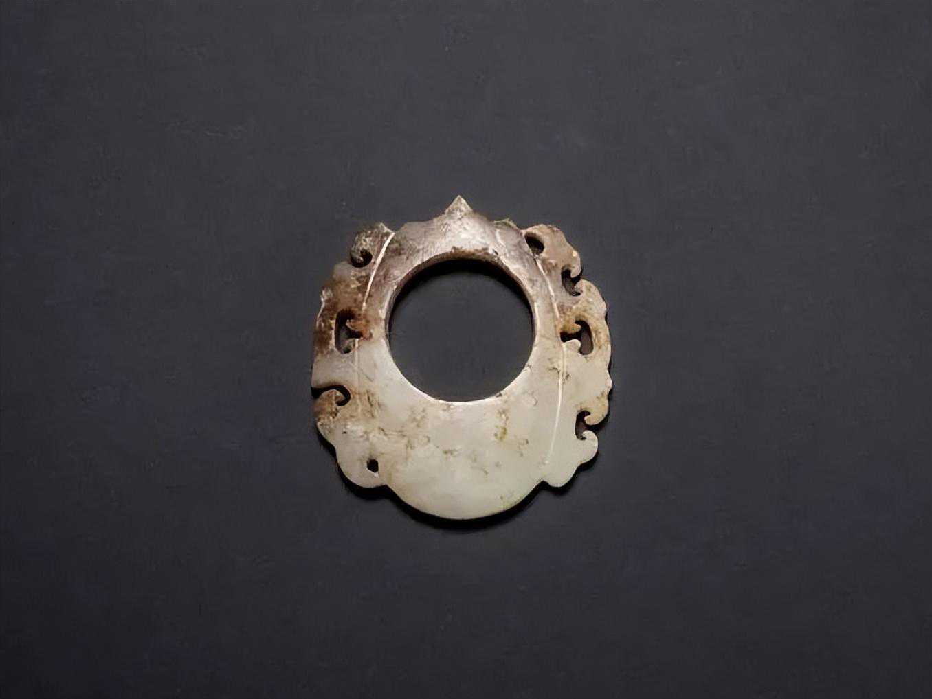 鸡心佩,是韘形佩的俗称,由玉韘演变而来。韘是古人拉弓射箭时扣弦用的一种工具,是弓箭手射箭时保护拇指不被弓弦勒伤的器物。此佩为白玉质,局部受灰黑沁,主体作鸡心状,中开圆孔。玉佩以出廓形式在鸡心外雕琢双螭龙图样。身体婉转,雕琢灵动。