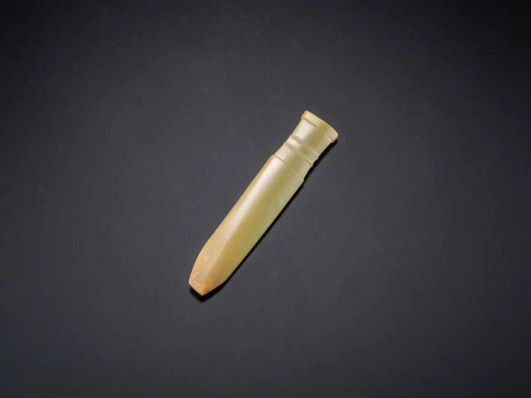 柄形器形器身形修长,平顶外凸,颈部呈弧形内收,整体光素无纹,线条简洁流畅,表面打磨平整光滑。玉质光气莹润。柄形器是古代贵族身份的象征,等级颇高,为收藏之佳品。