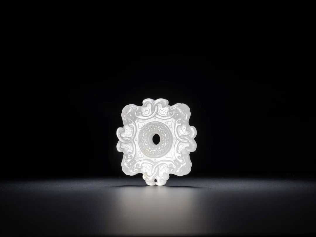 此佩为白玉质,细腻无暇,光气精良。整体形态内圆外方,中间穿孔,内缘圆润周正。环绕孔洞,雕琢云龙纹玉璧纹饰,古意盎然。外缘四方雕琢龙头,龙须交结缠绕。造型精巧别致,风韵古雅,交结佩为典型的清代玉饰件,寓意广游九州,结交四方,威震天下。为收藏、把玩皆宜的雅物。