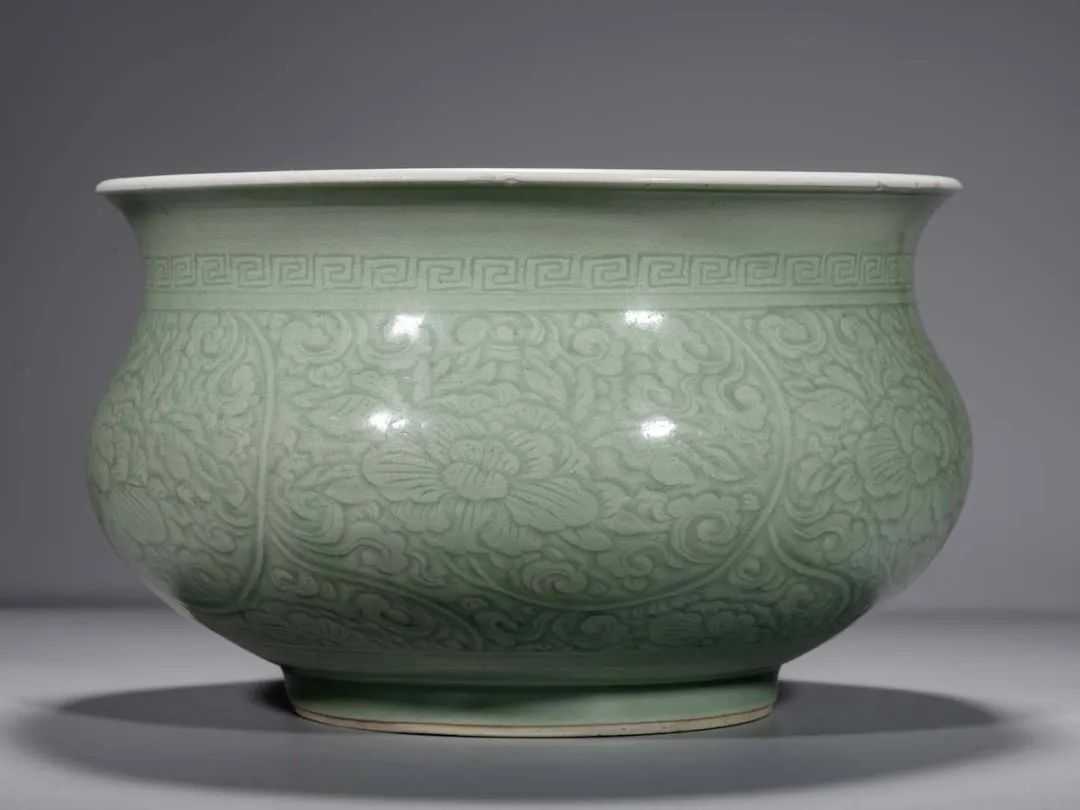 青色自宋以来便是文人阶级所追崇的颜色,各时期景德镇均有烧造。康熙时期的豆青釉有深、浅两种,本例即为颜色较浅者,釉色淡雅悦目。青釉内暗刻缠枝牡丹花纹饰,花朵恣意富有力量感,表现了康熙一朝蓬勃昂扬的社会气质。另炉内里满施白釉,釉面匀润坚致,应为官窑所烧制的赏玩器。